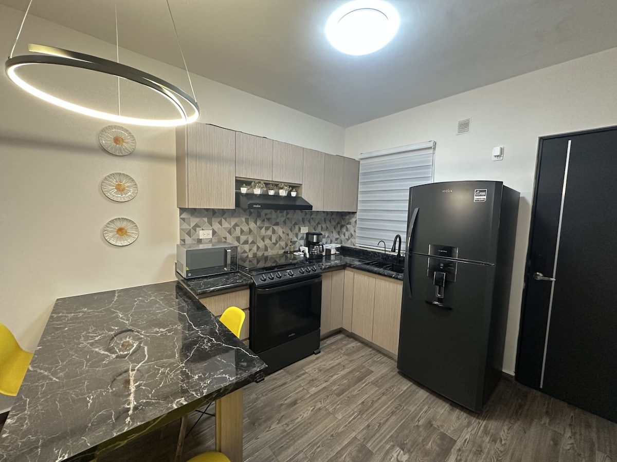'Cumbre del Norte' Come and stay in our spacious house: two bedrooms, living room with sofa bed, table with 6 chairs, kitchenette, breakfast bar, hot water, mini-split air conditioning throughout the house, close to industrial parks. 5 minutes from the Northern International Airport in Salinas Victoria. We invoice individuals and legal entities.