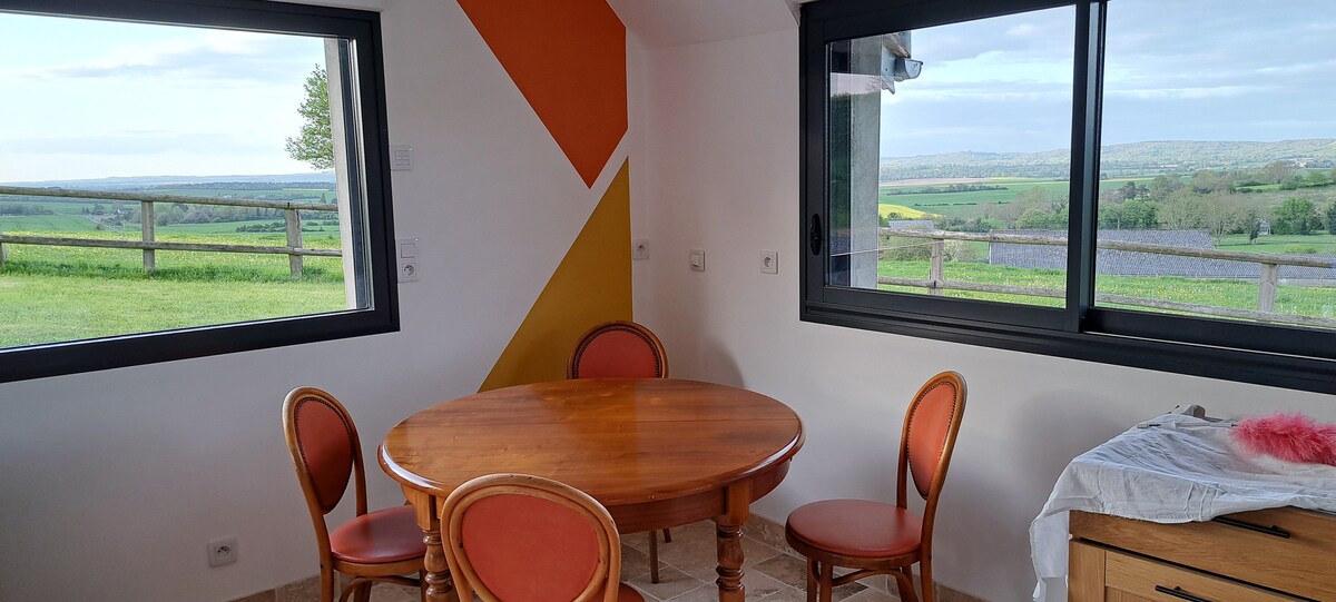 Welcome to Gîte de la Tourelle. In the heart of Chambois, 10 minutes from Haras du Pin, we will be happy to host you for a stay in the countryside. 80 m2 annex house with: On the ground floor: - Dining room with open kitchen - a bathroom Upstairs: - living room with a double bed 160 x 200 and workspace - a first bedroom with a double bed 160 x 200, dressing room and shower room - a second bedroom with two single beds 90 x 190