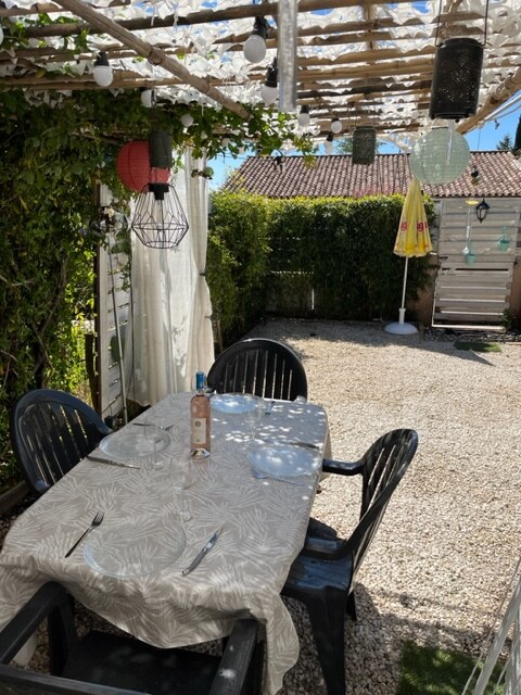 50 m2 renovated house with closed mezzanine bedroom in quiet residential area on the heights of Manosque, with a dining area and breakfast in a veranda, shaded outdoor dining area under pergolas and private parking in front of the house. Secure garden access for bicycles, motorcycles. 160 X 200 bedding, equipped kitchen, air conditioning, TV, washing machine, ironing board, washing machine and dishwasher. Oven and microwave, Nespresso coffee machine, kettle and toaster, fiber Wi-Fi.