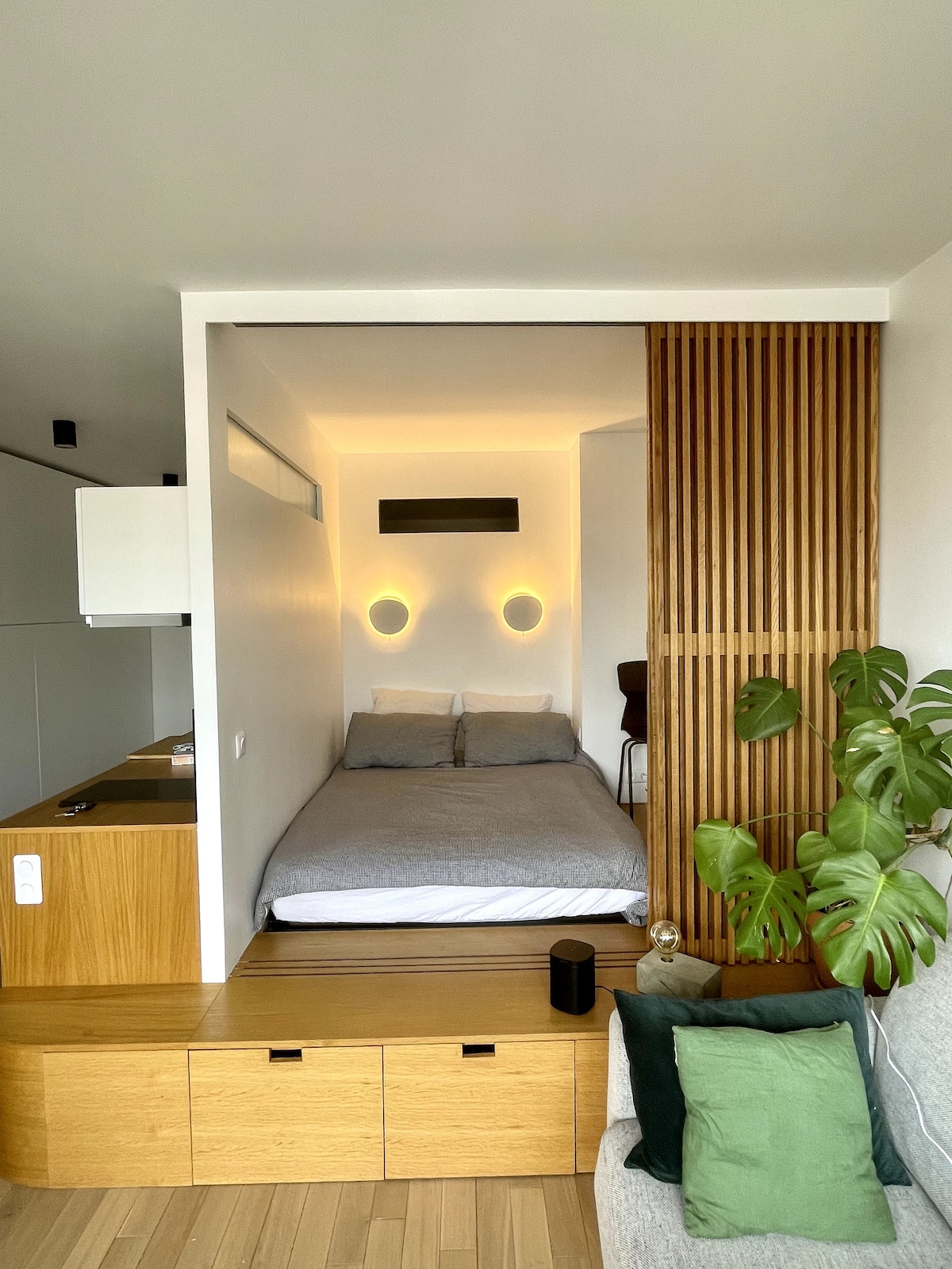 This cosy and unique apartment, ideally located 1’ from the canal, 5’ from Parc de la Villette and 9’ from Buttes-Chaumont, offers 30 m² that are elegant and fully equipped. You’ll find a superb fitted kitchen, a workspace with a 34’’ curved screen, and a comfortable 160x200 bed combined with the living room. A large mirrored wardrobe, a Jacuzzi, lights with adjustable intensity and a 55’’ screen will enhance your evenings. The accommodation also has a 120x60 baby bed with a mattress.