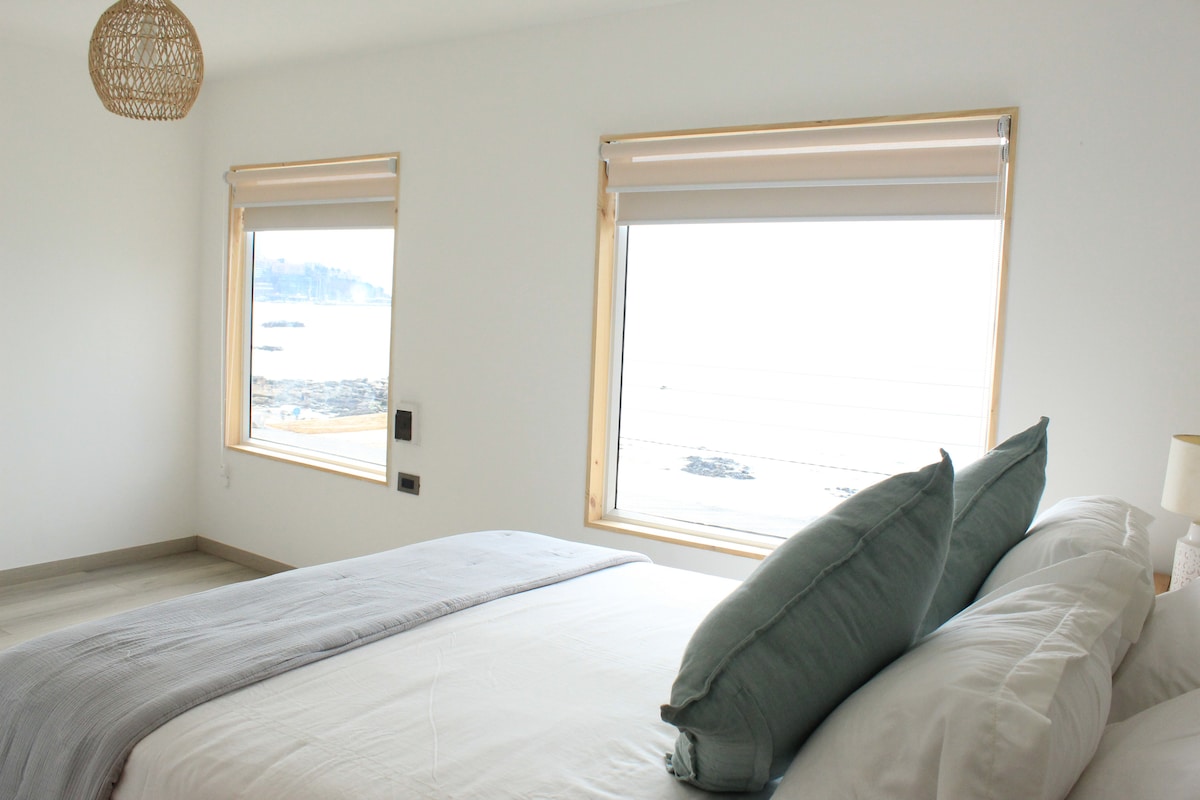 A bright room with windows that offer a spectacular ocean view. In the center, a modern Jacuzzi invites you to relax while enjoying the scenery. Minimalist and warm decor, with neutral and relaxing tones. The room includes: pool, king-size bed, continental breakfast, minibar, heating, smart TV, Wi-Fi, cable, parking. The quiet and comfortable atmosphere, accompanied by the sound of the waves, creates the perfect refuge to rest and enjoy the surroundings.