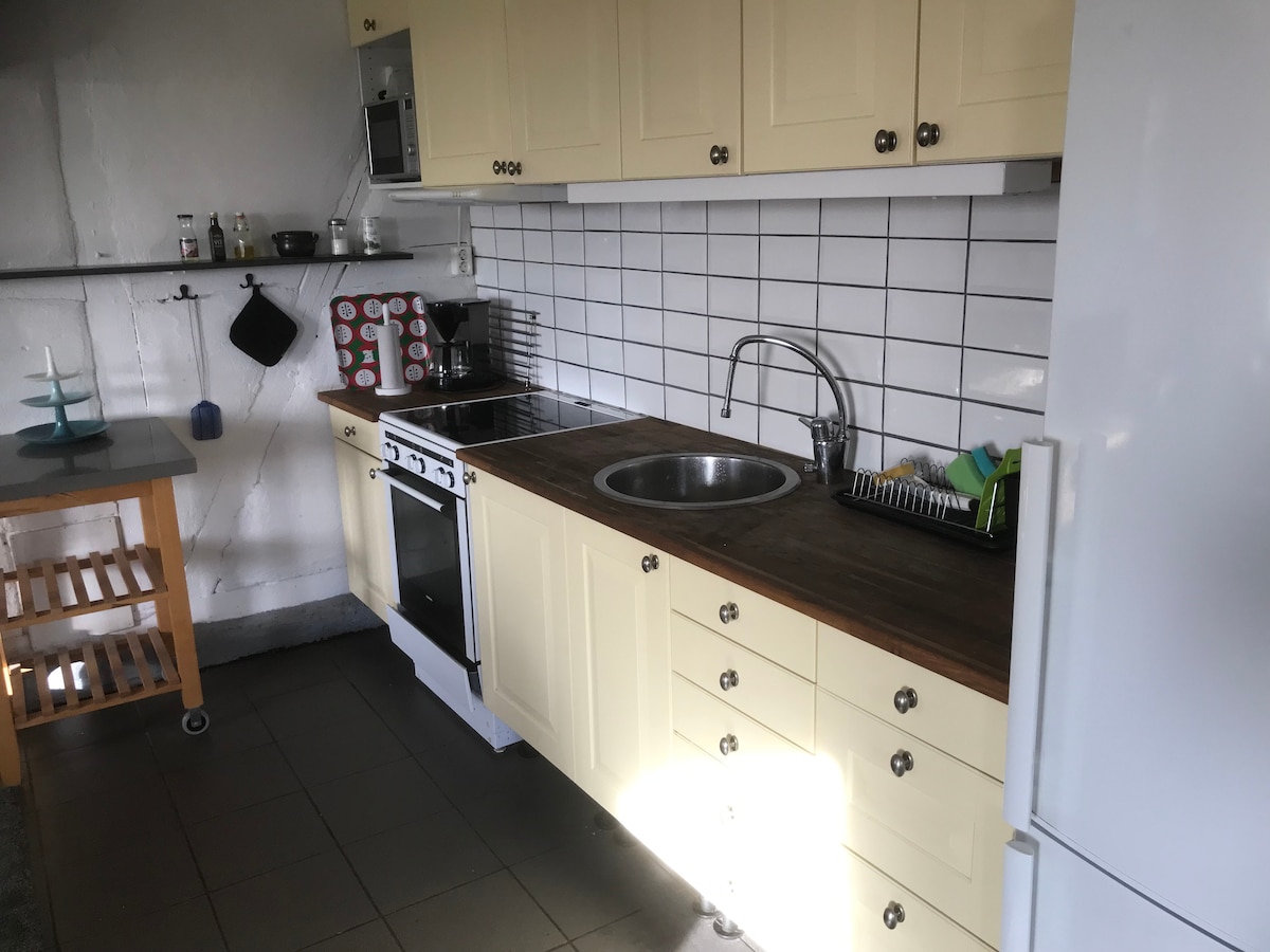 Charming farmhouse in central Falkenberg. The feeling of staying in the countryside and still be 300 meters from Stortorget. Private patio with barbecue and parking in the yard. The cottage has two floors - the upper with three comfortable beds and the lower with a small kitchen and dining area, sofa, TV with basic channels and bathroom. Tea and coffee are provided in the cottage. Breakfast/breakfast bread can be found at the adjacent bakery. Wi-Fi Toilet and paper towels, dish detergent, soap and shampoo at your disposal. Speaks Swedish, English, French.