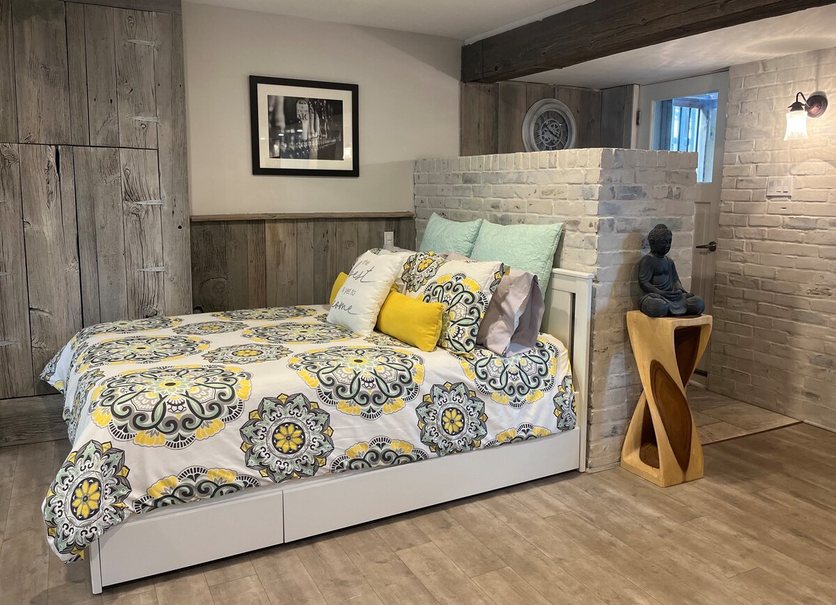 Inspired by the beauty of rustic European farmhouses, this bright, spacious studio space has room to stretch & practice yoga in the lounge and a private deck to enjoy your morning coffee with views of the vineyard in the back. It’s within walking/biking distance to local wineries, restaurants and a grocery store, very close to hiking trails and on a popular cycling route. There are many delightful culinary options as well as some local highlights such as the Watering Can.