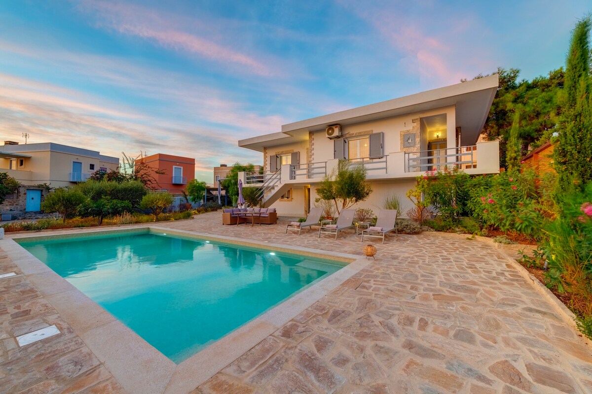 A luxury Villa with a Pool to enjoy hospitality offering breathtaking views of the sea and the endless blue. Suitable for couples or groups of friends seeking the ultimate relaxation and tranquility for an ultimate holiday experience in a modern setting. The spacious residence offers comfortable accommodation, accommodating up to ten guests in 4 bedrooms and also includes a pool, a fully equipped kitchen, living spaces, outdoor lounges, spacious yard, a patio and a terrace with amazing views.