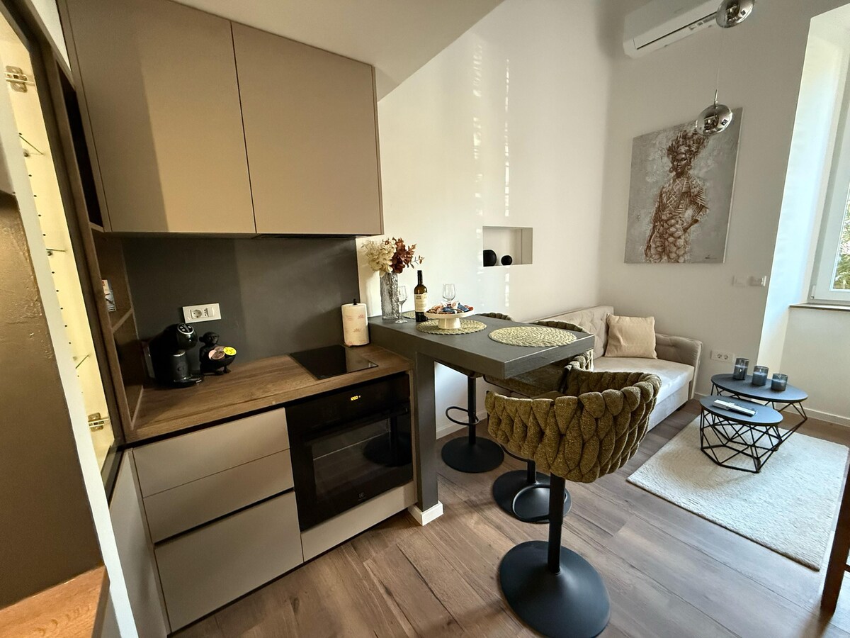 The apartment is situated close Opatija city center, only a few minutes away by car or an eight minutes walk. It consists of a living room, bedroom, a dining room, two bathrooms, kitchen, sauna, open space lounge, terrace, a surrounding garden and a car parking. Thanks to the fact of being in the ground floor with a surrounding garden you have the sensation of renting a house and not an apartment.