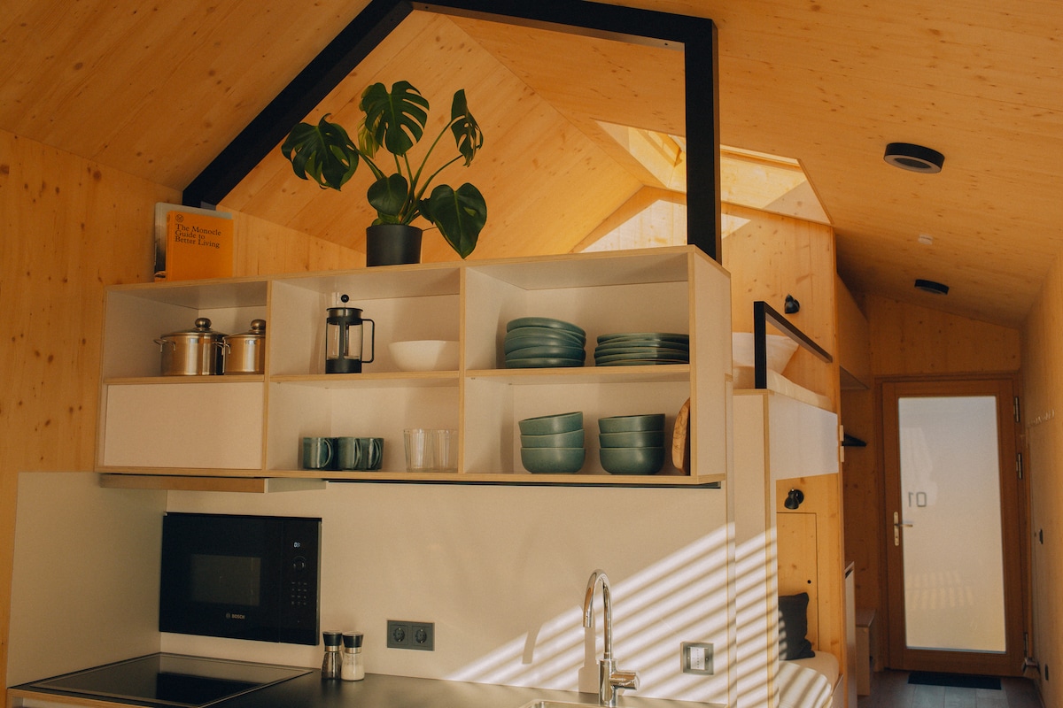 Das wunderschöne Tiny House befindet sich in Lauterach – einem Vorort von Bregenz. Das Haus bietet Platz für 2 Gäste. Die Räumlichkeiten umfassen eine voll ausgestattete Küche, ein Badezimmer mit Dusche (Föhn vorhanden) sowie einem Schlafzimmer mit Doppelbett (1,60m)