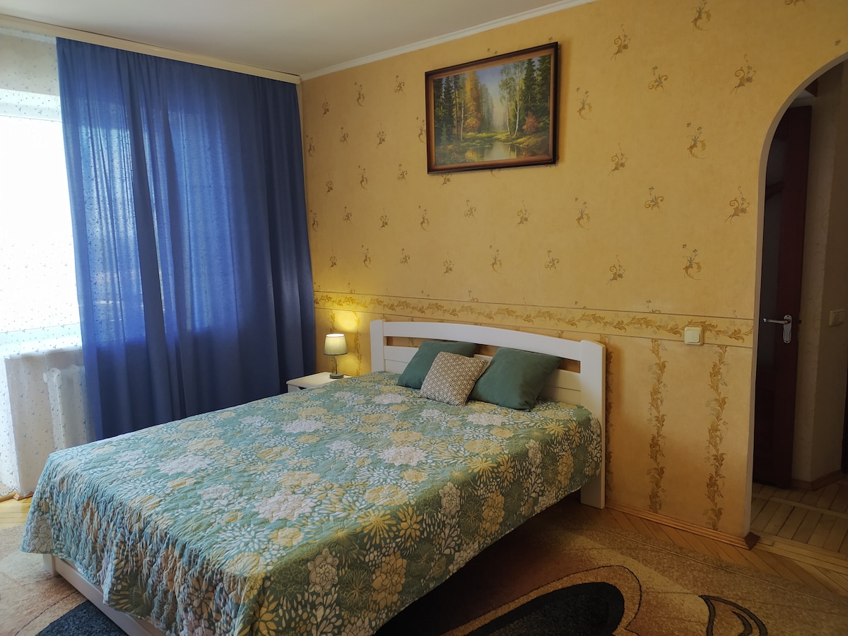 A studio apartment just 1 minute away from Minska Metro. Minimalistic, clean, cosy and stylish, the apartment features a working area, large sleep sofa (2m x 2m when unfolded) and a panoramic view from the 9th floor. It will take you about 15 minutes to get to the city centre by metro.