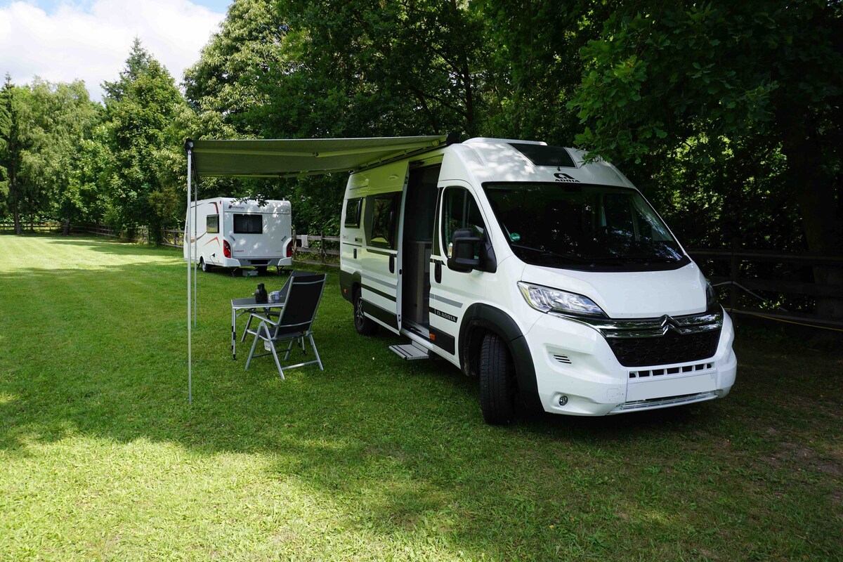 Enjoy a vacation on our orchard meadow in rural idyll. Here you can be for yourself and relax. The camper has a cozy sitting area overlooking the horse paddock, a small kitchenette, solar power and a double bed. In the nearby manor house (about 100 m) are the toilets and the shared bathroom as well as the possibility to use Wi-Fi. The extensive property with a park invites you to explore & relax.