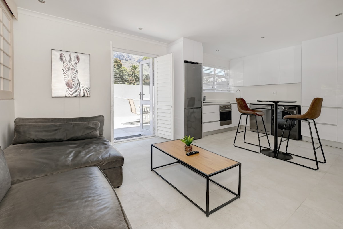 This newly renovated apartment sleeps 2 adults + 1 child & lies at the foot of Table Mountain,offering lovely views of nearby Lion's Head & Table Mountain. Although attached to the main house, the former art studio is completely private, with the en-suite bedroom leading onto a spacious deck, fitted kitchenette & open plan living area .The sofa is big enough for a third person to sleep. Located within 10 min drive of the city centre & 15 min to Clifton Beach, this holiday home has all you need.