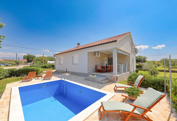 Entire house with a pool, located in Poljica, near beautiful towns of Zadar and Nin. Three bedrooms and two bathrooms. Peaceful and quiet, away from traffic and city noise. Variety of nearby beaches (sand, pebble, hidden), all available within 7-20 minutes by car. National parks with all their beauty are just an hour away. Or you can just rest by the pool.