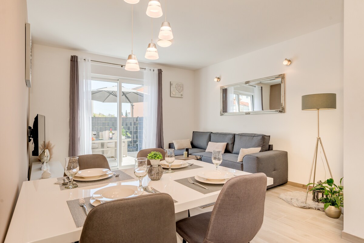 La vie est belle is new, modern and luxury apartment located only 3 minutes away walking from historical UNESCO old town Trogir. Has 54m2 and 30 m2 garden where you can enjoy in barbecue facilities. Comes with two bedrooms, a living room, bathroom, a fully equipped kitchen with a dining area,flat-screen TV in every room and free Wi-fi.Offers free parking spot. All atractions are near by. Split airport is only 5 km (or 9 minutes away).Beach is 7 minutes away. Baotić Marina is 7 min away by car.