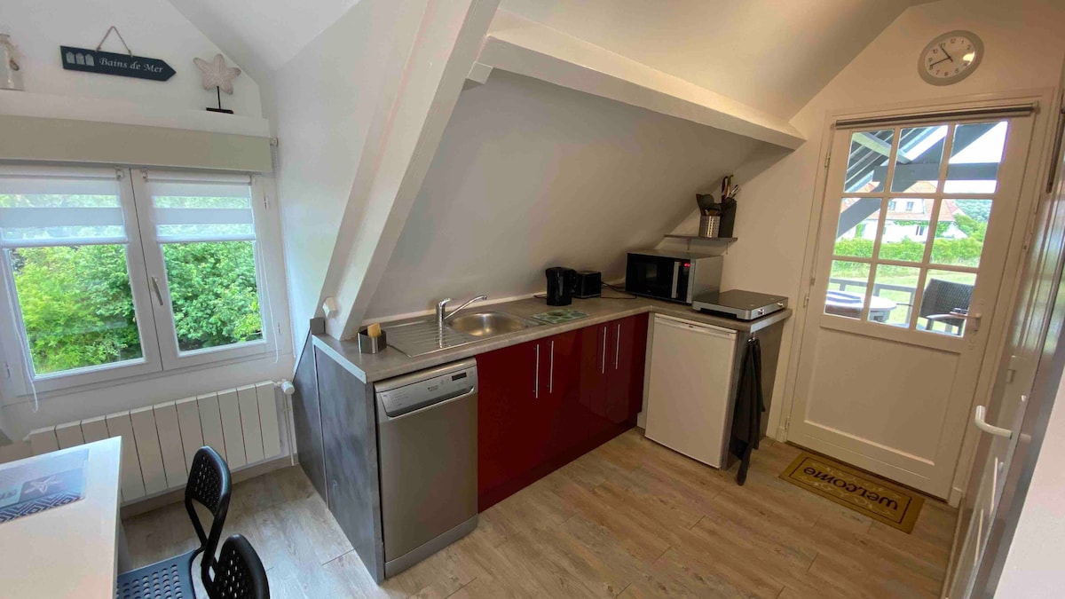 Logement indépendant dans propriété privée au cœur de la baie d'authie. Au 1er étage de la maison avec un accès indépendant par un escalier extérieur. Séjour avec cuisine équipée (four combiné, frigo, lave vaisselle, cafetière Nespresso, plaque induction)canapé rapido, TV. Chambre avec lit 160x200 et lit 90x190 (possibilité lit parapluie et chaise haute). Salle de bain avec douche, wc et rangements Terrasse couverte À 5km de Berck ,15km du touquet et 20km de la baie de somme