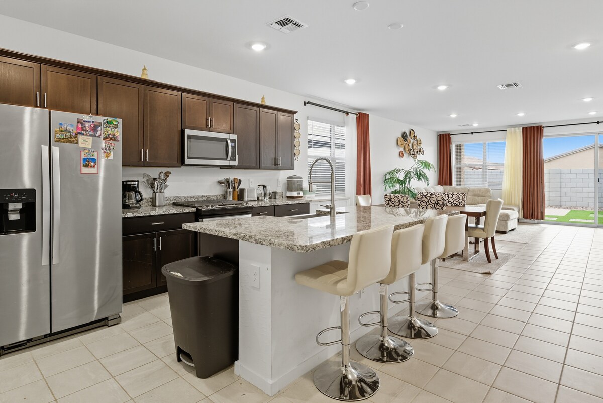 The Surprise Getaway is perfect for families! Our 3400 sq ft, spacious 5 bedroom and 3 bath home sleeps up to 11 in beds with a maximum occupancy of 14 guests. We have a private heated pool with a waterfall and slide. There is a game room with air hockey, a poker table, arcade game, and pool table. There are TV's throughout and an Xbox in the loft. The luxury kitchen is fully stocked and has a large dining area and family room for lounging around.