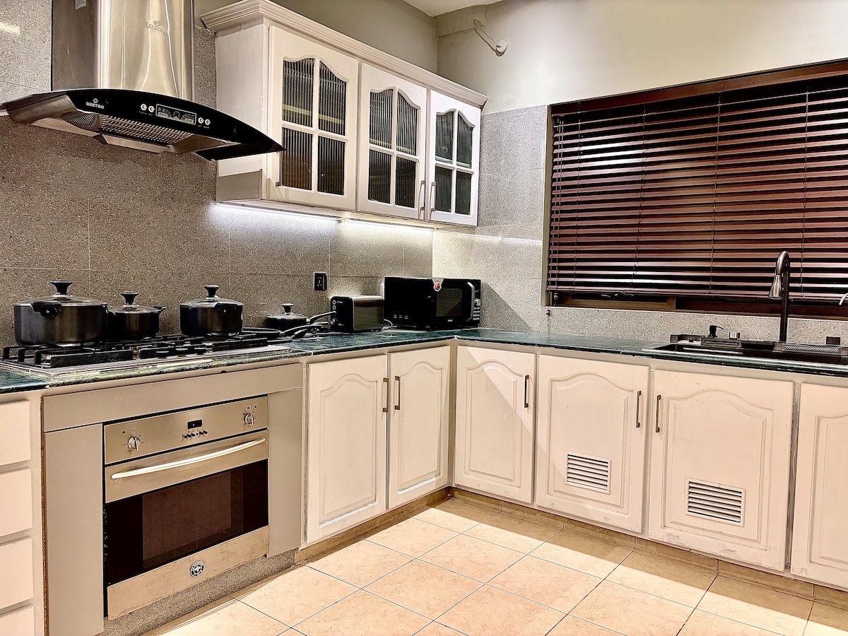 Welcome to @blueoakresidences Spacious 1500 Sq ft apartment in F-11/1 Islamabad with 2 ensuite bedrooms each with a private balcony, Powder room, UPS backup, Fast WiFi, Self check-in, and a 58" smart TV. Kitchen, hot water, free parking, 24/7 elevator included. For groups larger than 4, 2 extra floor mattresses are provided for up to 6 guests. Bassinet available on request for 3+ nights (PKR 5000). Steps from Loafology, Nando's, Asian Wok, KFC, Al-Fatah. Family-friendly park right outside.