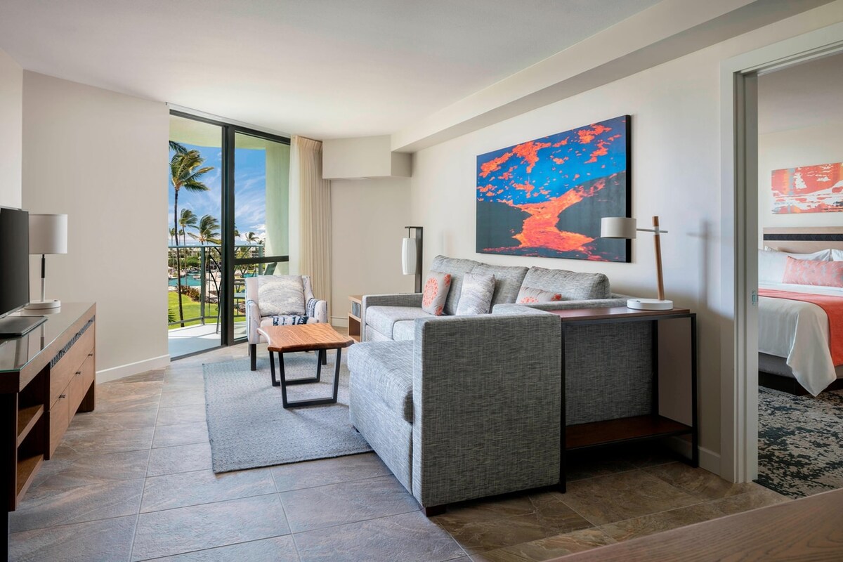 Relax in this spacious 1-Bedroom Resort View suite at Hilton Grand Vacations Ocean Tower at Waikoloa Village. Located within the Hilton Waikoloa Village resort complex, this large 590 sq ft suite features a private bedroom with two double beds, full bathroom with a free-standing shower, and a comfortable living room with sofa bed and a separate dining area.