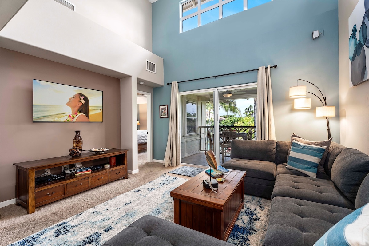The spacious living area features a comfortable sectional sofa, wooden ceiling beams, and natural light from large sliding glass doors that open to a lanai. A wooden coffee table holds decorative accents, while a ceiling fan enhances airflow throughout the room.