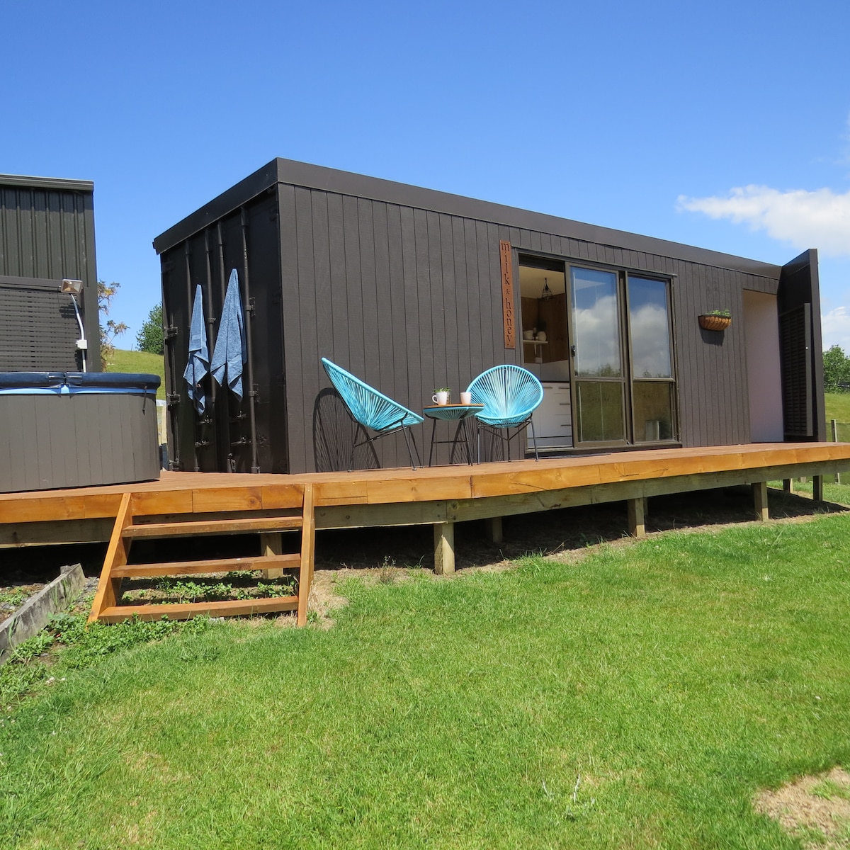 Welcome to Milk & Honey Luxe Cabin, our 20ft shipping container which has been converted into a fresh and modern glamping rural retreat. Enjoy complete privacy on your own deck and relax under the stars in the outdoor spa whilst looking out to rolling hills and lush surroundings.