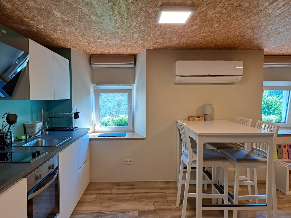 Ancien four à pain entièrement rénové. Logement disposant d'une pièce de vie composée d'une cuisine équipée, d'un espace repas et d'un coin salon. La chambre en mezzanine dispose d'un lit double et donne accès à la salle de douche. Le logement est équipé d'une buanderie avec frigo, four micro-onde, lave-linge. Wifi disponible gratuitement de même que téléviseur équipé de chaînes non payantes. Le logement est idéal pour un couple ou un couple avec jeunes enfants (canapé-lit dans le séjour).