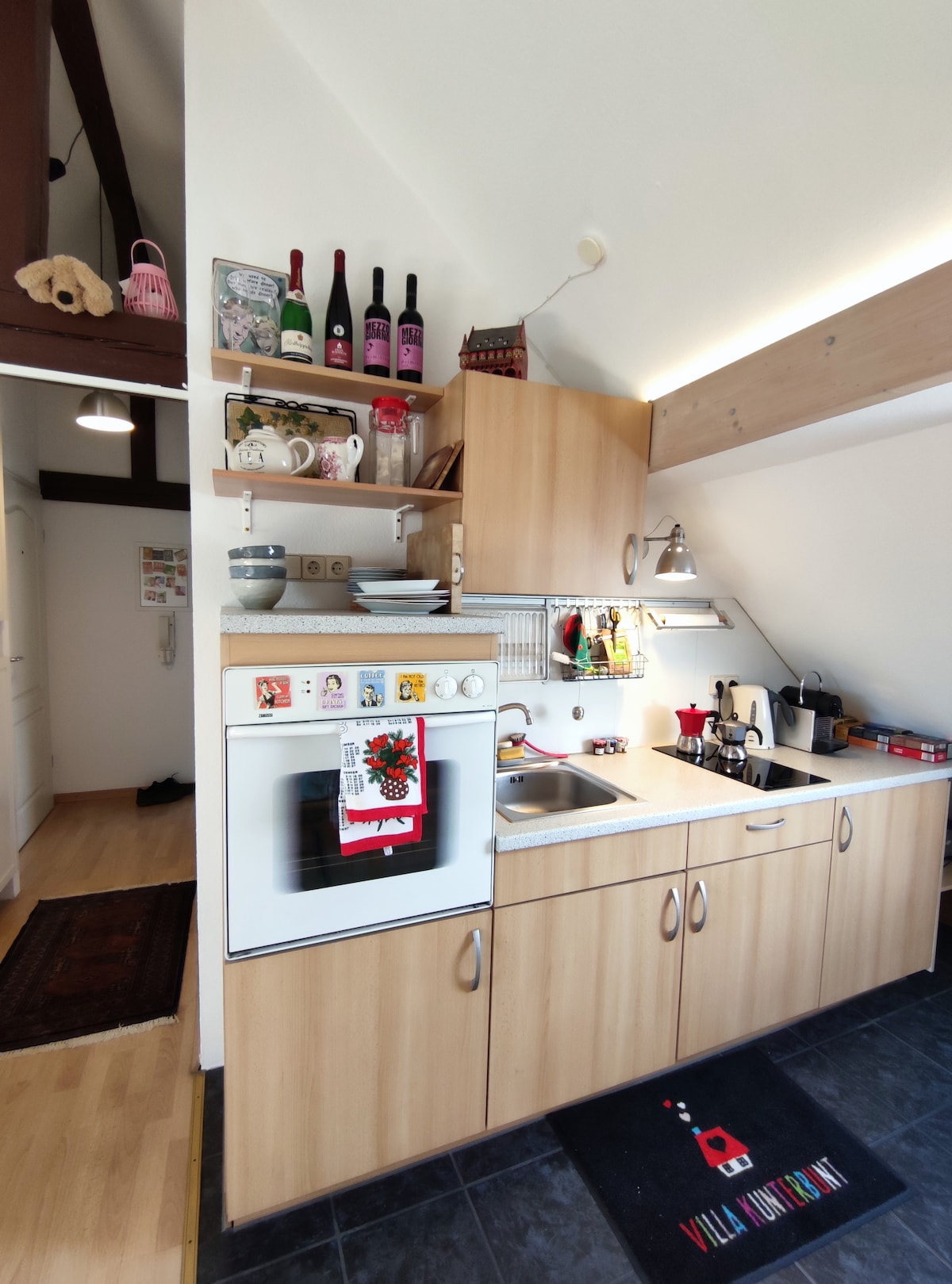 Central, historic, individual & spacious: Welcome to our beautiful 85m² maisonette apartment in the middle of the picturesque old town of Ettlingen. It is part of a listed building that has existed since the 17th century. You will sleep where stablehands and coachmen stayed over 200 years ago. It has been lovingly renovated. Discover the original charm of the sandstone wall and wooden beams, combined with the aesthetics of a bright loft with an open-plan concept.