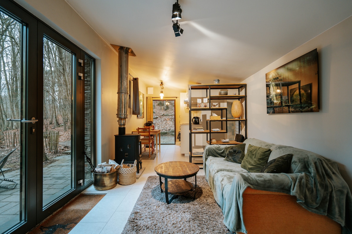 Welcome to the "Copa Cabana", very bright, at the bottom of a garden. Ideal and private little paradise to recharge your batteries and take care of yourself in beautiful nature. Sit on the hanging terrace, amidst the trees, in a splendid setting and wake up to the sound of birds singing! Walk along the marked trails, explore the mountain bike trails, visit the Abbey of Villers and breathe the air of the forest, perhaps crossing a beaver 10 min walk away.