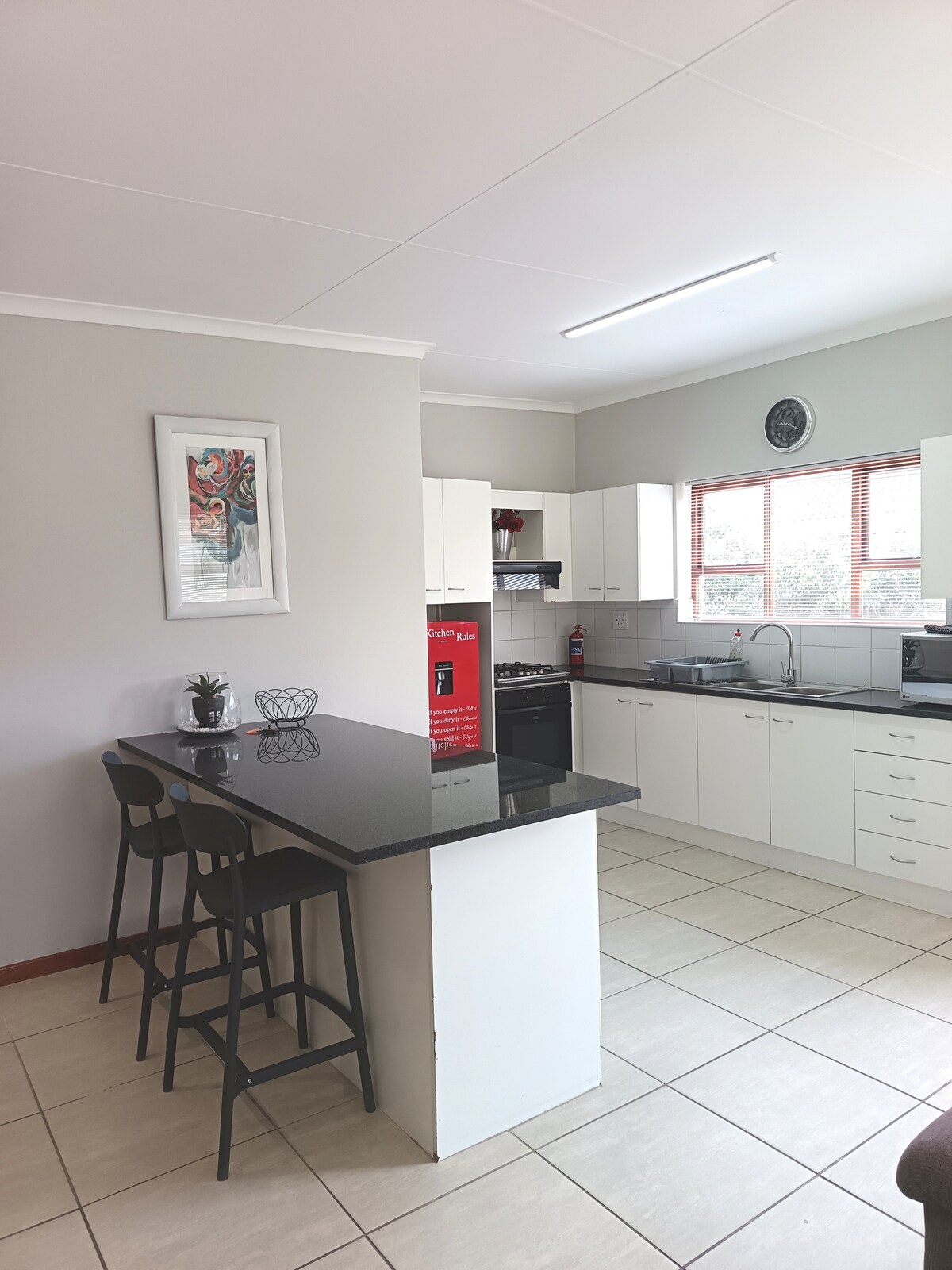 A spacious, modern, fully furnished, one bedroom, apartment, private entrance, up a flight of stairs. Ideally situated close to leading schools, hospitals, restaurants, malls, a short drive to stunning beaches. The 3.2m x 2.3m corner sofa can comfortably sleep an older child. For young children a mattress can be laid on the floor. There's a flat screen TV with Netflix & great Wi-Fi! Only registered guests may make use of the apartment. The pool is unfortunately for private use only.