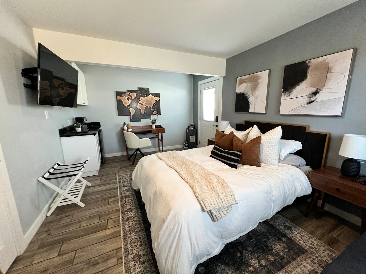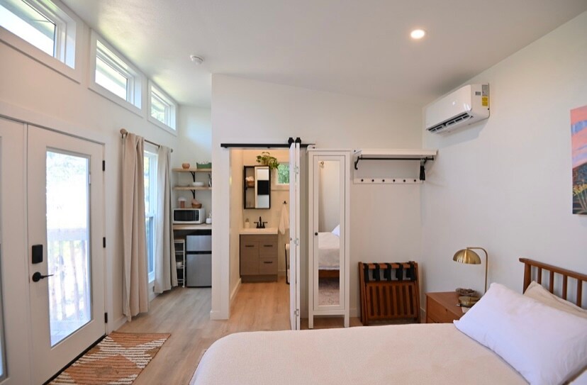 Come stay in this studio that has TONS of natural light & located only 10 -15 minutes from downtown. This newly added addition to our property has everything you need to feel cozy & comfortable. This totally private space from the main house offers a fully stocked kitchen to a full size bathroom with a washer/dryer combo. There isn't anything else you will need to stay for a while. Furnished with a queen bed & dresser as well as a couch that pulls out into a full size bed for additional guests.