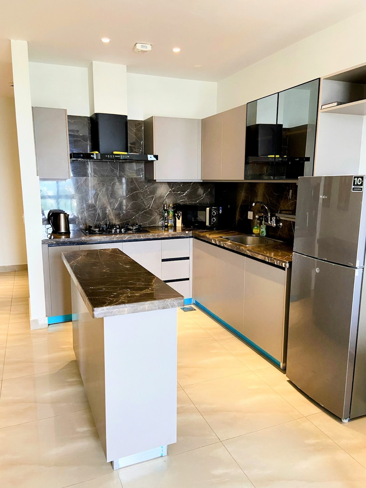 Step into a modern retreat designed for comfort and mood. The apartment features a stunning starlight ceiling that creates a calm, romantic atmosphere. Enjoy cinematic nights on a 65-inch Haier Android TV with high-speed Wi-Fi for seamless streaming. The equipped kitchen offers everyday convenience, while the soft mattress and spacious sofa ensure complete relaxation. Finished with modern interiors and artistic aesthetics, this space is perfect for cozy nights and stylish living.