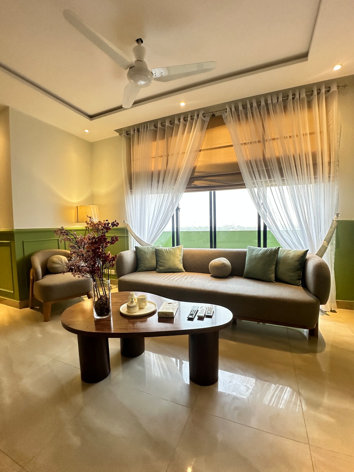 Our 1 BHK Orbit Penthouse in DHA Phase 5 is where urban chic meets celestial cool. Think: a glowing moon wall for those late-night selfies and a bold dollar-stacked art piece that screams "main character energy" Wake up to park views from your private balcony swing, binge your faves on the 50" 4K Smart TV, or cook up something aesthetic in the fully loaded designer kitchen. The interiors? Abstract, stylish, and made for the feed. Plus, you're right next to Lahore's hottest dining spots.