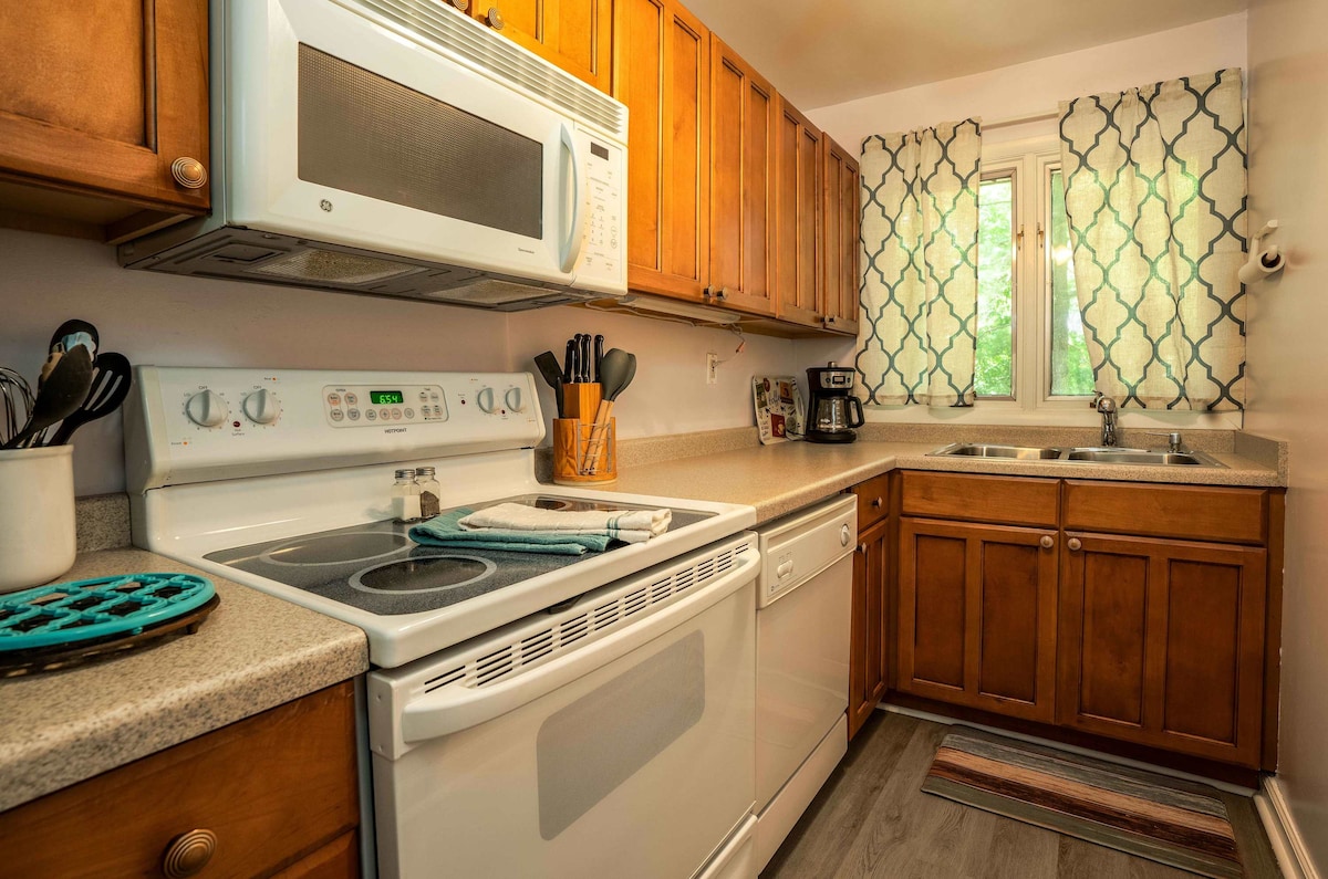 Discover the freshly renovated one-bedroom condo at the charming Hayloft Lodge, located a few miles from downtown Lake Geneva. Unwind on the comfy couch, enjoy a restful night on the cozy queen bed, or head downstairs for a fun game of pool. This end unit features a kitchen with a mini fridge & freezer, a two-burner stove, a Keurig coffee maker, & more! The fitness area is available year-round, while the pool is open seasonally. A washer & dryer are conveniently located just outside your unit.