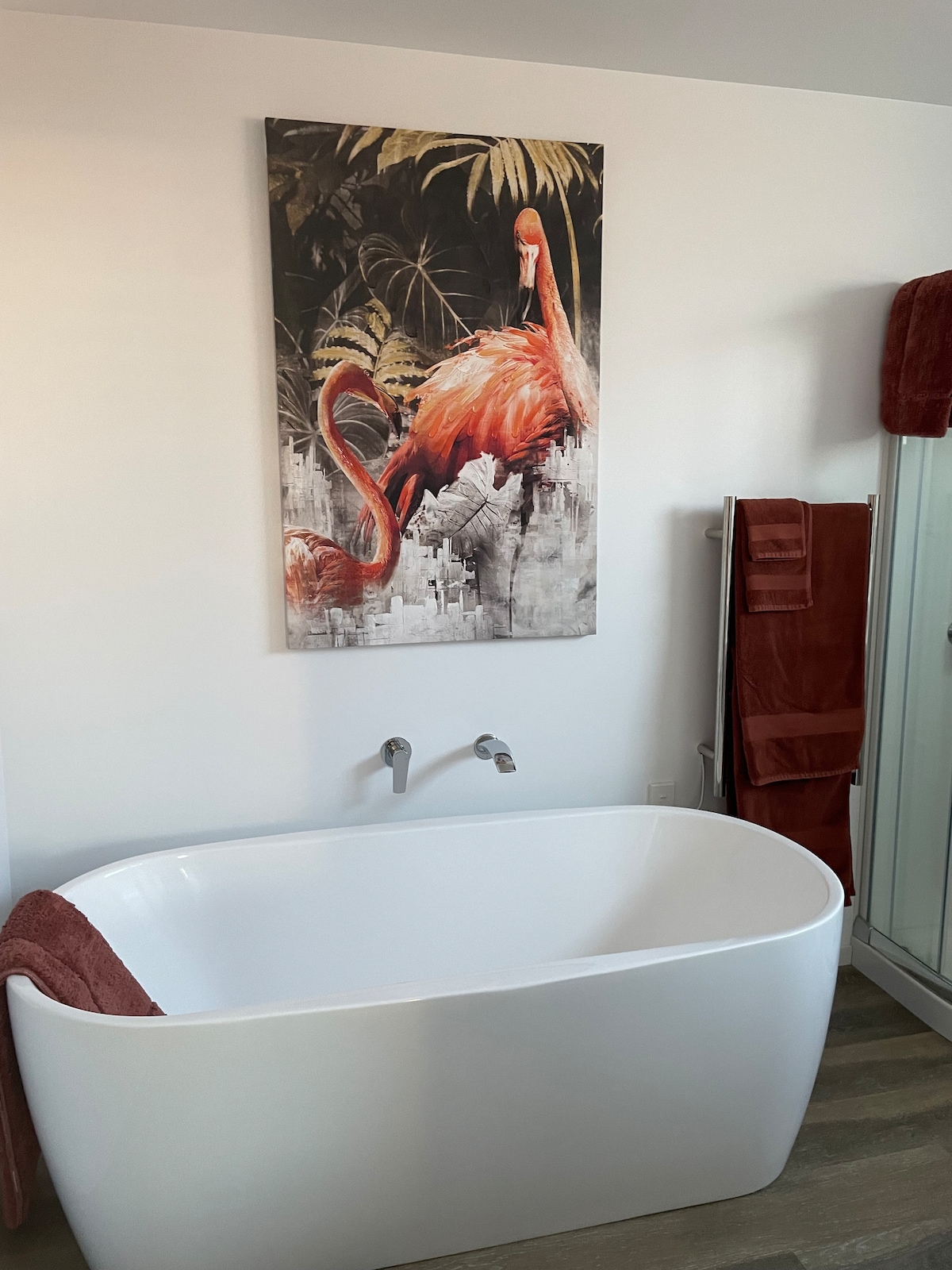 This separate ensuite unit is part of a brand new house. You have your own private access from the sliding door of your personal outdoor space. The room itself is light bright and airy with high quality furnishings, feather duvet and pillows and Egyptian cotton towels. It is a large space with plush armchairs for lounging and a breakfast table as well as outdoor seating.There is a heat pump to keep you cozy in the winter months, Smart TV with Netflix and WIFI.