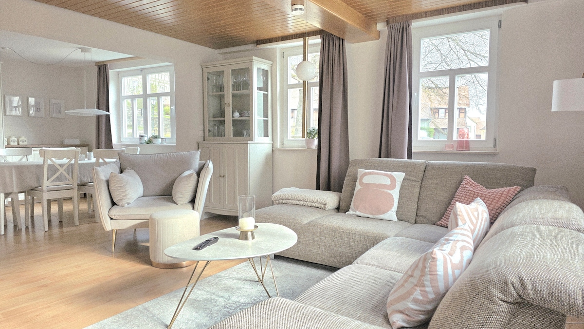 Cozy attic apartment in an idyllic location, combined living-bedroom with sofa bed for child(ren), fully equipped kitchen, private seating in the spacious garden. In the spacious bathroom with shower and toilet, there is also a washing machine and dryer. The couch in the combined living room/bedroom offers a sleeping accommodation for two children (up to 8 years free of charge). A bicycle garage is available for bicycles.