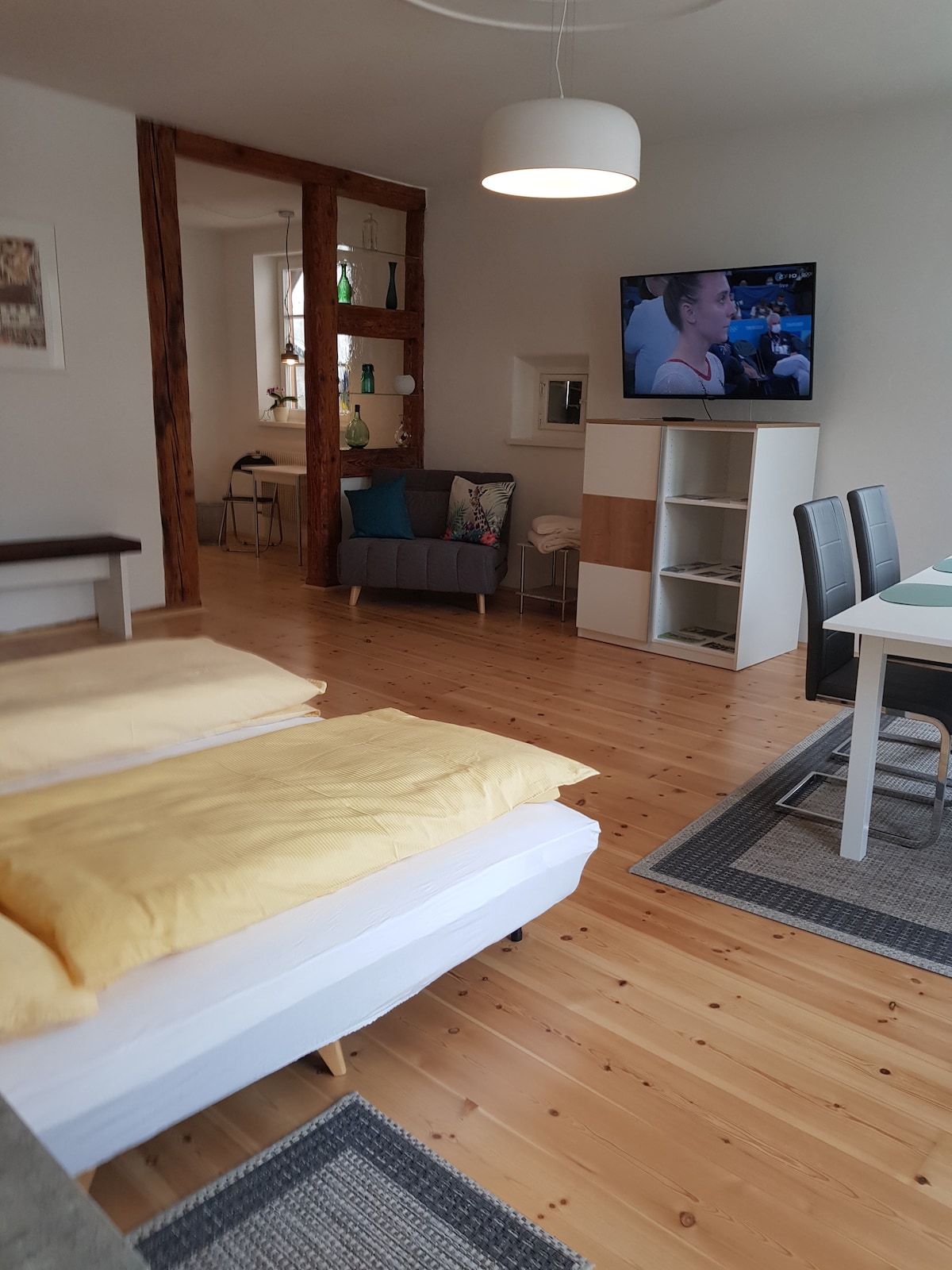 Unsere nette Souterrainwohnung ist in unserem Wohnhaus integriert. Sie befindet sich im Erdgeschoss rechts und hat einen separaten Eingang. Die Küche bietet eine großzügige Küchenzeile mit einer Essecke, Kaffeemaschine, Toaster, Großen Kühlschrank, Wasserkocher und Mikrowelle Das Schlafzimmer ist mit einem Flachbildfernseher und einem Relax Sofa ausgestattet. Die Wohnung befindet sich in sehr guter Lage, der Markplatz ist in 3 min zu Fuß zu erreichen.