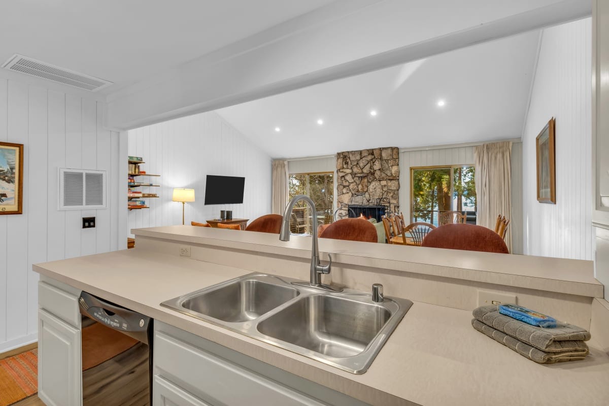 This is our Holiday Home and we just love the vaulted ceiling in the living area , it has a panoramic view of the Lake and you will find yourself just staring at the Lake Sunsets and Star filled Night Sky. It is a well appointed space with lots of unique artwork and a running theme of Bears and the Lake Life. You can see the lake from each Bedroom and it is very peaceful at the Bitterbrush Complex. In the Summer you are close to amazing Beaches , and in Winter the Ski Slopes are right there.