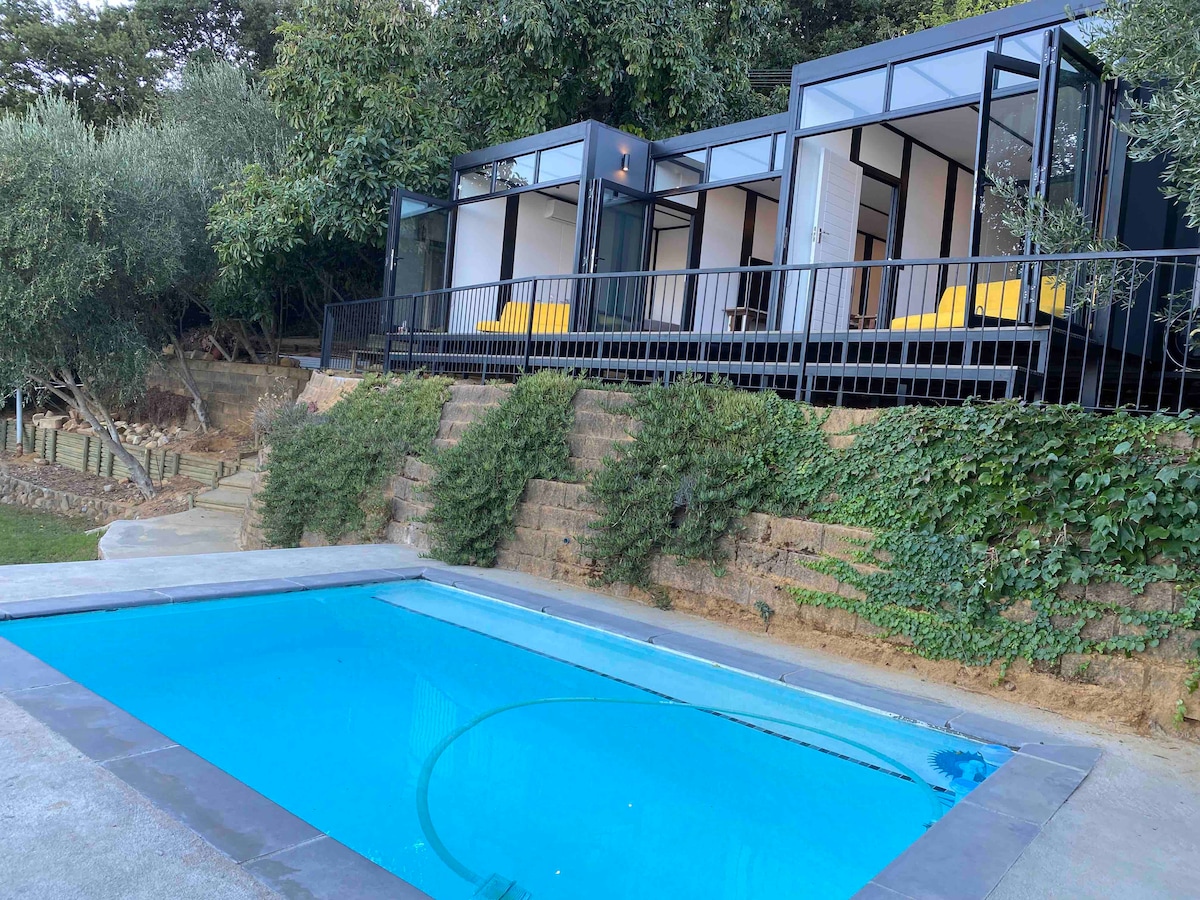 An ideal escape, our Studio is a private, self-catering garden unit located on the mountainside on a 300 Ha farm , with a pool (shared), & beaches closeby (15 min). Off the Grid - own power supply & fresh spring water extracted high in the mountains. Panoramic views over sea and mountain landscapes , surrounded by fynbos and wild birdlife , close to Capetown (55 km), airport, (40km) shopping amenities (7km) . Unwind after a busy day and relax at your private boma or around the pool.