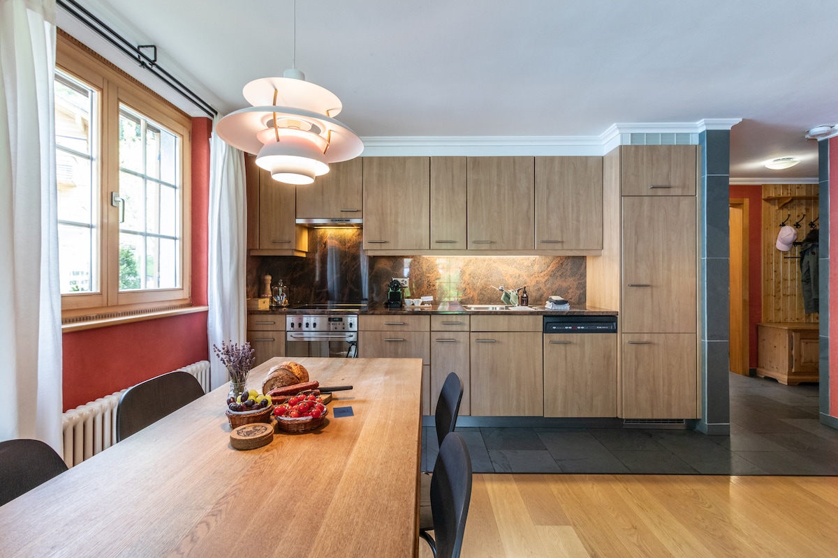 Spacious & bright ground floor apartment. Ski-in, ski-out. Quiet neighborhood, open floor plan, one bedroom, large garden terrace & stunning mountain views. King bed (180cm x 200cm), full kitchen, Nespresso coffee machine & coffee pods, electric tea kettle & tea. Bicycle & winter gear storage in cellar. Hike-in, hike-out or bike-in, bike-out in the summer. Suitable for max. 4 people. Located in the the same chalet as our "Modern Wengen Studio" and a short walk from the Wengen train station.