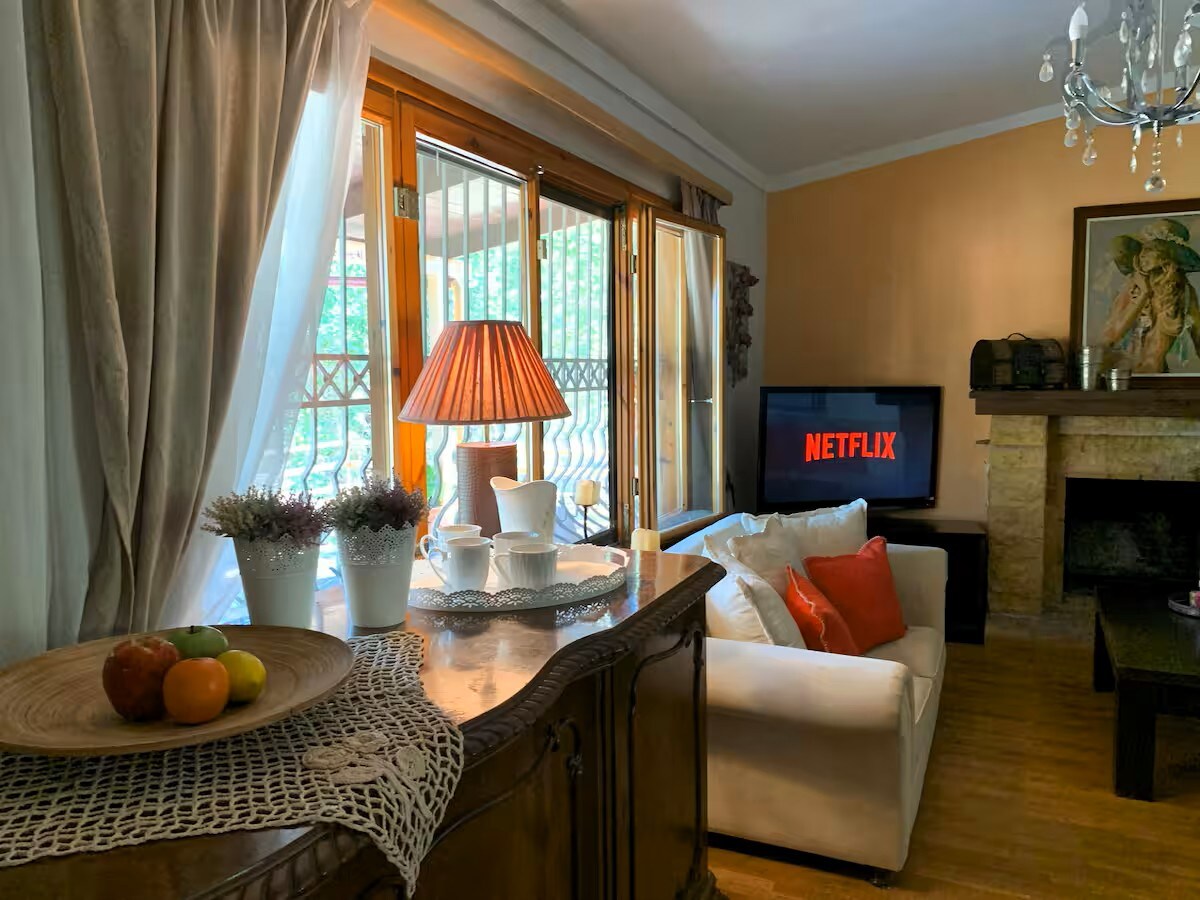 This exquisite apartment is located at Valaoritou street in Agia Paraskevi, one of the most beautiful areas of the southern suburbs of Athens that has a lot of green areas, quietness and safety. Its privileged position offers easy access to Attica Tollway (only 800 m away from junction Y3) and a convenient parking space. In order to go to the center of Athens, visitors will need approximately 11 minutes, as the metro station is only 90 m away from the apartment.The neighborhood has a lot of parks, restaurants,cofee shops,gym and a big super market near byThe whole building, the interior of the apartment and the exterior balkony area are constructed in a way, so that the house is functional and tasteful. Its equipment and furniture are selected with a focus on modern and minimal style. The apartment is arranged so that it can accommodate a couple or a family with (2) children. In the main area, there is a living room with a corner couch that is easily transformed into a bed, situated in front of the fireplace that creates a warm and cozy atmosphere in the cold winter nights. The kitchen is fully equipped with all necessary kitchenware and has a spacious refrigerator, a washing machine and an electric oven. The bedroom has a queen-size bed. When you open the main French window of the living room, you step out in a beautiful balkony with a lot of plants where you can enjoy a coffee, lunch or dinner with the company of friends