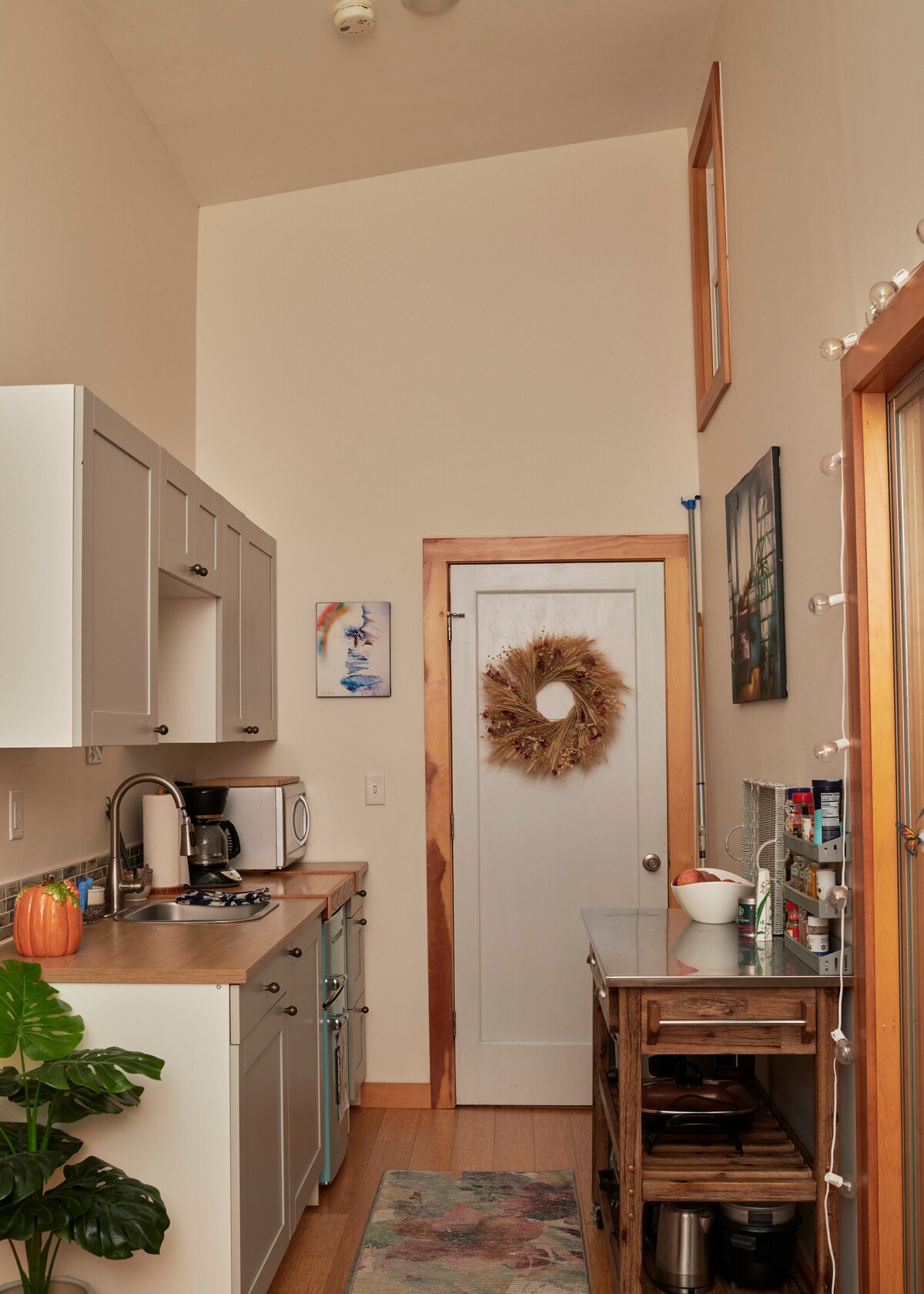 This brand new cabin was built using green construction and features a living green roof. It is an open concept 1 bedroom with all new fixtures and a soaking tub. You can walk to town in approximately 10-12 minutes. This is in a neighborhood so there are visible neighbors but the architect utilized the natural surroundings to make it feel like you are in the woods. The beauty of this house is it’s access to town. If you look at my past reviews it’s the same location but a new house in front.