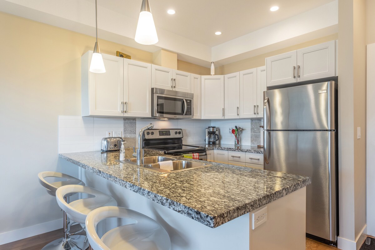 This 2-bed, 2-bath beautiful, modern condo has plenty of space. Located on the edge of downtown, it is easy walking distance to Knox mountain, restaurants, pubs, shopping, beaches and much more! With one of the largest patios in the building, you will enjoy afternoon and evening sun with views overlooking the downtown skyline. The master king-size bed has a comfy Endy mattress, walk-in closet and bath and the second bedroom has a queen bunk with a twin on top with a walk-in closet and bathroom.