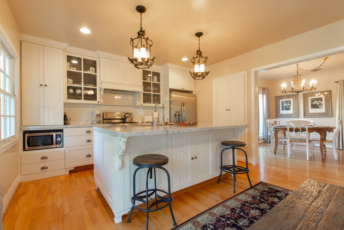 CLEAN and BRIGHT 1260 sq. ft. double master HOUSE all to yourself. A/C, 2 queen beds, walk-in closets, wood floors, nice TV entertainment setups, washer/dryer, parking, remodeled chef’s kitchen, 2 coffee makers (drip and French press), dishwasher, and dining room. Large front and back GARDENS (shared*) with a rear porch, gas BBQ, small outdoor fire pit. WiFi, cable TV, Blu-Ray players/access to Netflix, Hulu, etc in every room. Living room has FIREPLACE, Surround Sound, queen fold out couch.