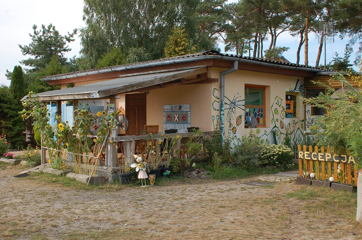 Welcome to our candy factory realm! This cute caravan is placed directly by the lake Resko, 5 minutes walk from the sea. It has a fridge, kettle, private wooden terrace and tiny herb garden. We provide beddings as well as basic dishes, cutlery. Bathrooms are shared with the rest of our campsite community. We have 2 outdoor showers which are a great experience. You also get access to our outdoor kitchen with a stove and gas bbq. Closest Biedronka is 10 minutes by bike from us. We got bikes :)