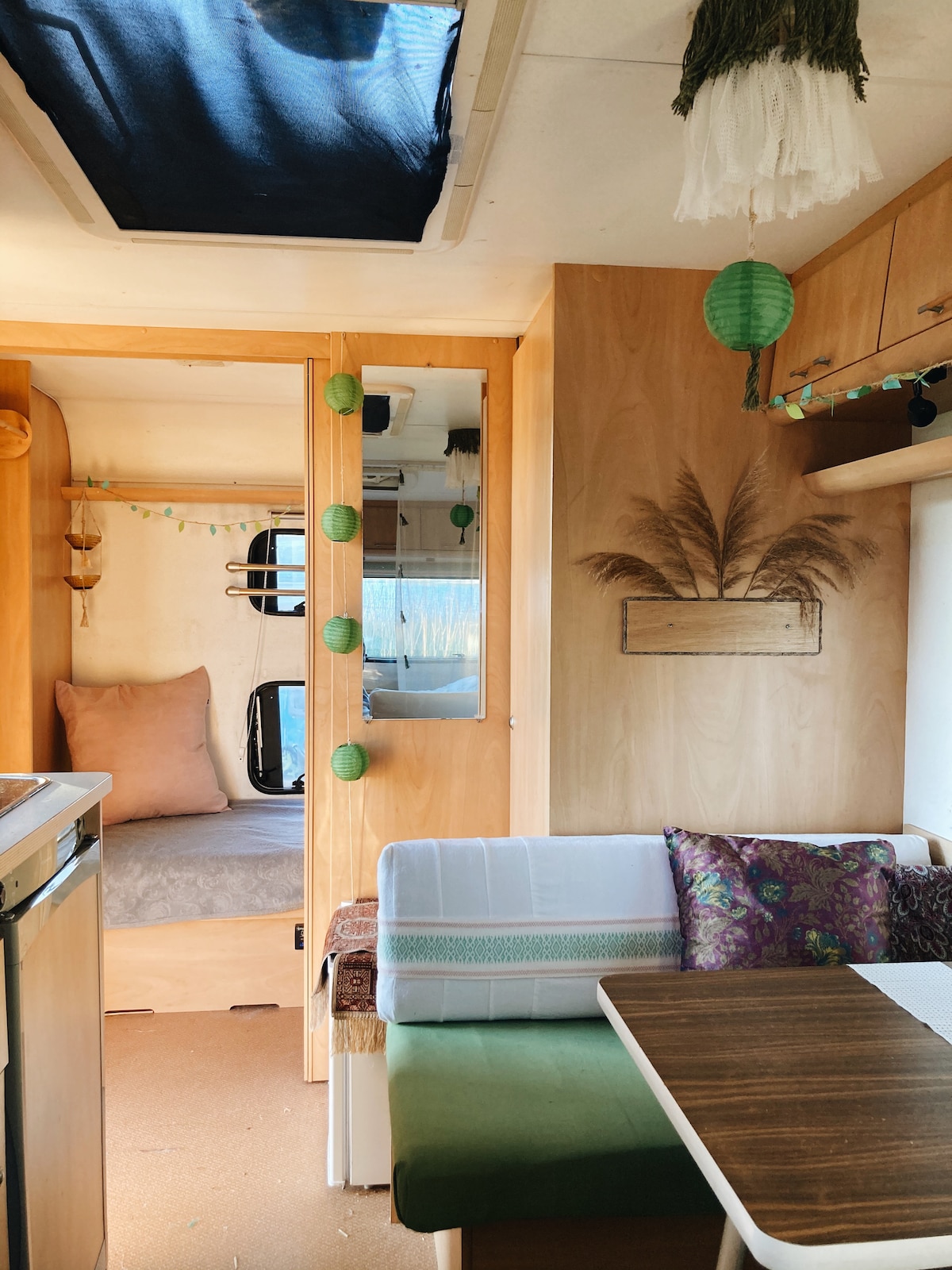 Welcome to one of our RV with handmade decorations! Wake up in nature and enjoy a morning yoga session or coffee on our wooden terrace with a lake view. We're based on a camping site by the lake "Resko", 5 minutes walk from the seaside. Your caravan is equipped with a fridge. There are 2 double beds and 2 single beds. Bathrooms are shared with the rest of our campsite community. There are multiple toilets and showers. Feel free to ask us questions. Can't wait to see you at our oasis :)