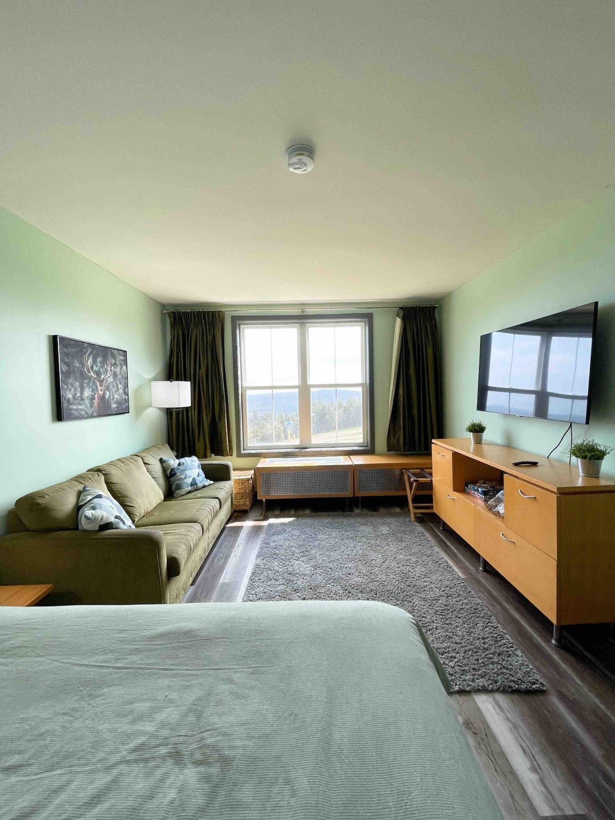 "The mountains are calling and I must go!" Experience Snowshoe Mountain from our slope-side studio apartment. Truly one of West Virginia's hidden gems, enjoy a breathtaking view of the lake and mountain, ski-in/ski-out with complementary secure on-site equipment storage, 24/7 gym access, common lounge area with oversized chess board, free parking, and more. Located conveniently above equipment rental and ski-school. Only steps away from shopping, dining, and entertainment hub- The Village.