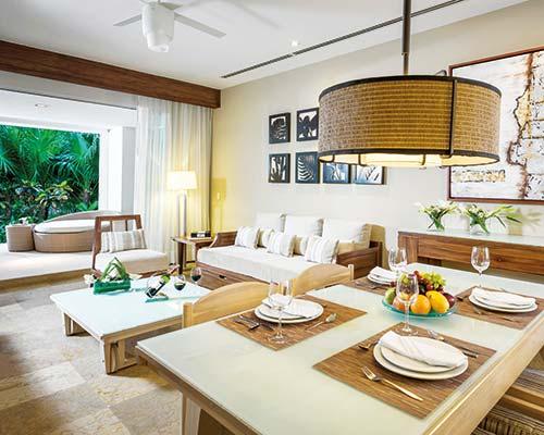 The One Bedroom Suite features a bedroom and living room, complete with a dining table and kitchen. It has a terrace with private plunge pool and two LCD televisions. Also features one bathroom with Jacuzzi tub. Accommodates 4 adults, 2 children.