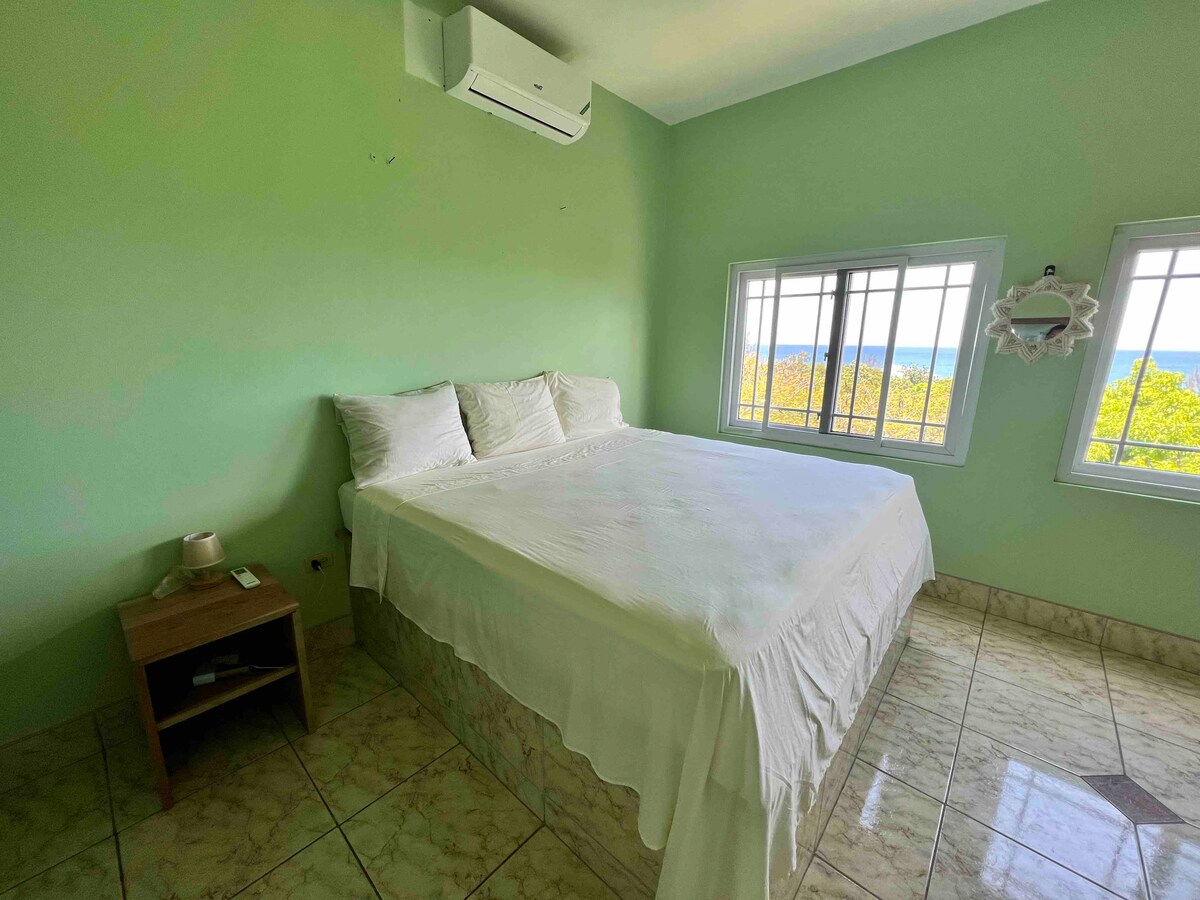 Wake up to sweeping views of the Caribbean Sea in this light & airy, spacious unit. Ideal for anyone needing inspiration to write, create, do yoga, or simply to breathe. This space features a living room with a TV & Amazon Fire Stick, a dining area, a full kitchen, a palatial bedroom with king size bed & A/C, & an open plan bathroom (with hot shower). Our sun-heated pool is steps from your front door, just past your private patio. You'll live eye level to the infamous "Best View in Negril".