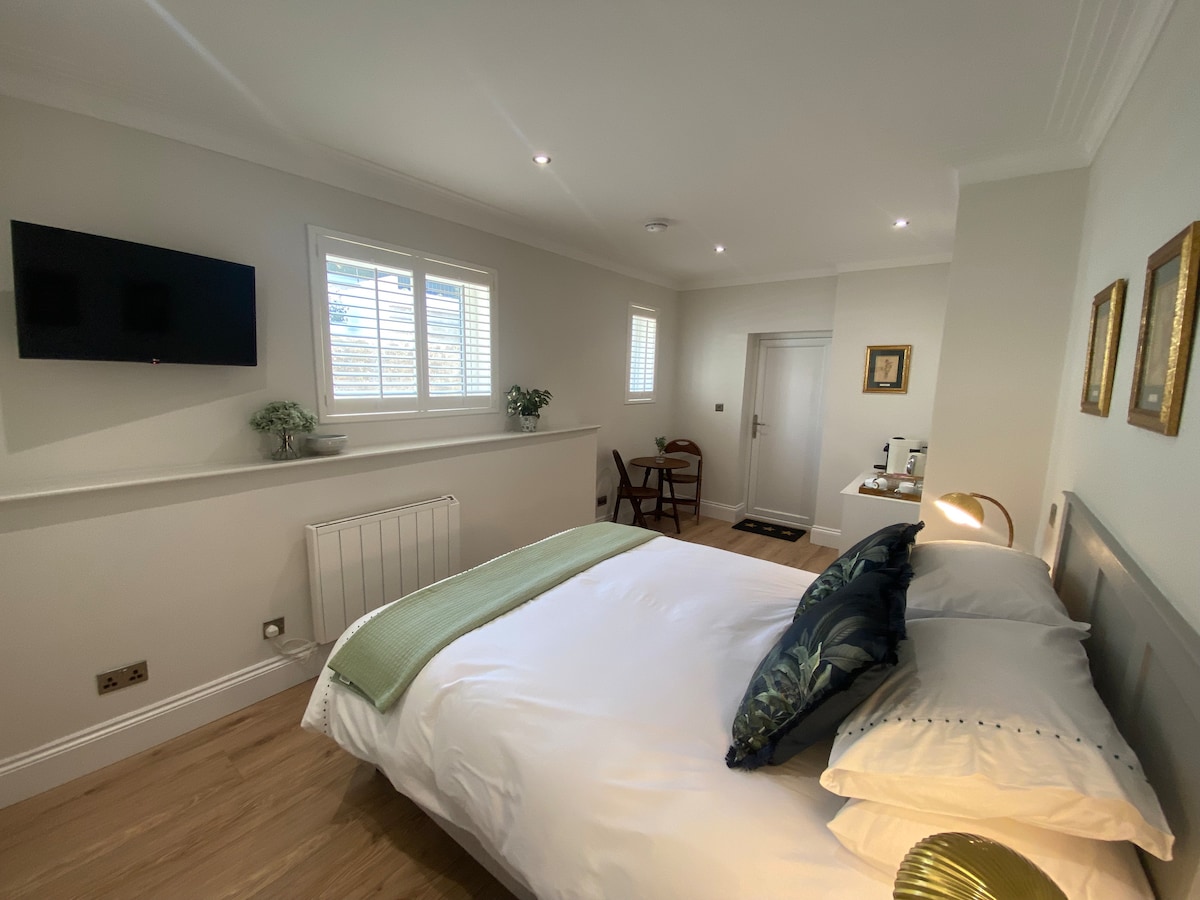 Stylish, beautifully decorated with king-size bed and a stunning en-suite shower room in Swanage. Located on a quiet residential road near the hospital and is a 5/10 minute walk down hill to the shops, restaurants , pubs and the beach. The Garden Room is at rear of main house and has its own front door and separate entrance so guests come and go as they please. Designated outside seating ( up steps). Parking on site. Continental breakfast is provided 8.30am. Check in 3pm checkout 10.00am.
