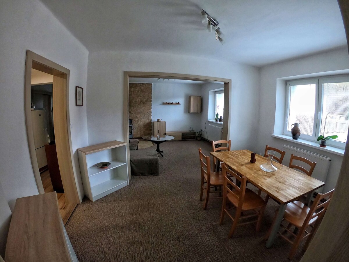 Enjoy a peaceful stay in the Beskydy Mountains with views on the Wallachian hills. This private apartment on the second floor of a family house has its own entrance and terrace. It's an ideal place for a retreat from the hustle and bustle of the city. It's also ideal for adventurers exploring local tourist spots, mountains, ski resorts, cross-country trails, and plenty of fantastic cycling routes (bikes and gear can be stored in the garage). Everything is within easy reach.