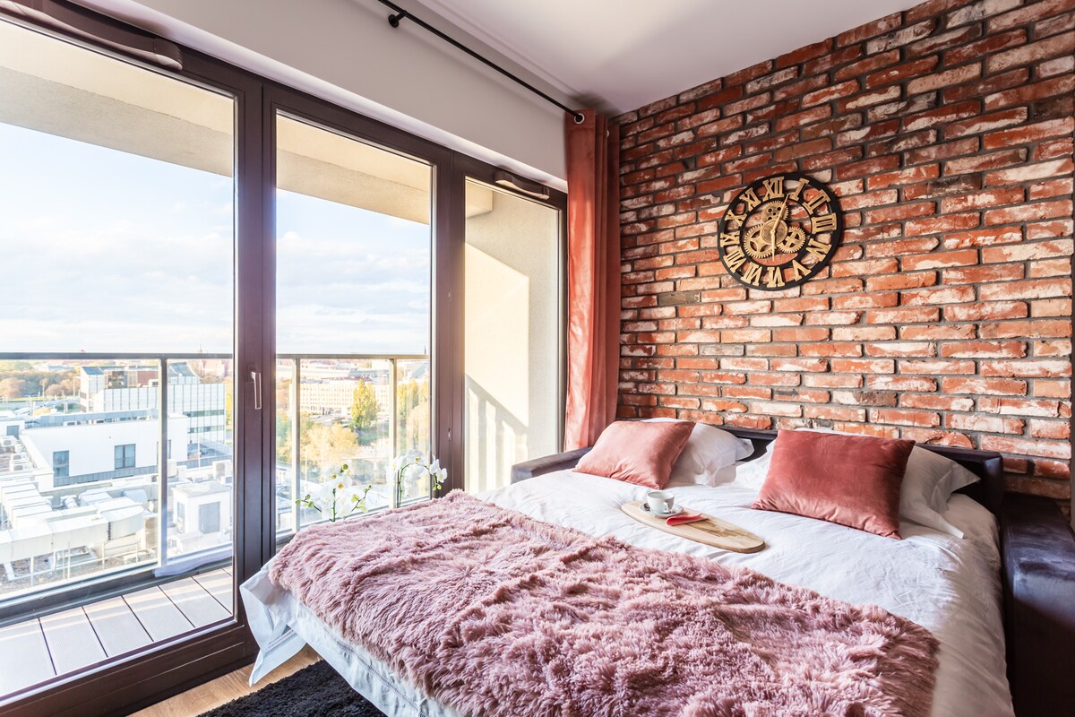 An exclusive, modern and functional apartment with a bedroom, large living room with a beautiful view of Wroclaw. It is located in a new apartment building on the 13th floor with its own underground car park and 24/7 security. The fully equipped kitchen allows you to prepare homemade meals. High standard, comfort, security and a sense of privacy make guests feel at home. Wireless Internet and Netflix. Access to the gym, dry and steam sauna, jacuzzi and children's playroom.