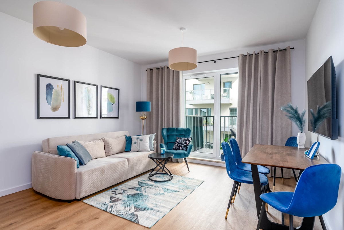 We invite you to stay in our new apartment, which we have prepared for your comfortable stay. The apartment is located in a new estate on the border of the city centre, furnished and equipped so that guests can feel comfortable here both during holidays and business stays. The convenient location allows you to quickly reach the main places in Warsaw, as well as easily get to the airport and the capital's railway stations in 10 minutes.
