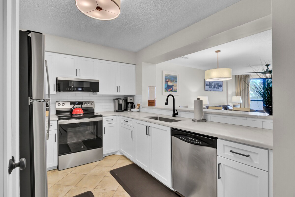 This beautiful 'Pottery Barn' style decor condo Sleeps 6 with a King Poster Bed in the Master Bedroom, a Queen Sleeper Sofa in the Living Room and Twin Trundle in the Entry Room. The Bathroom is decorated with bead board walls and has a walk-in tile shower. White cabinets, Granite Counter tops, Stainless Steel Appliances and a separate dining area make up the Kitchen. A Screen Porch with Ocean/Pool views and comfortable high-end All-Weather Wicker furniture completes this beautiful condo.
