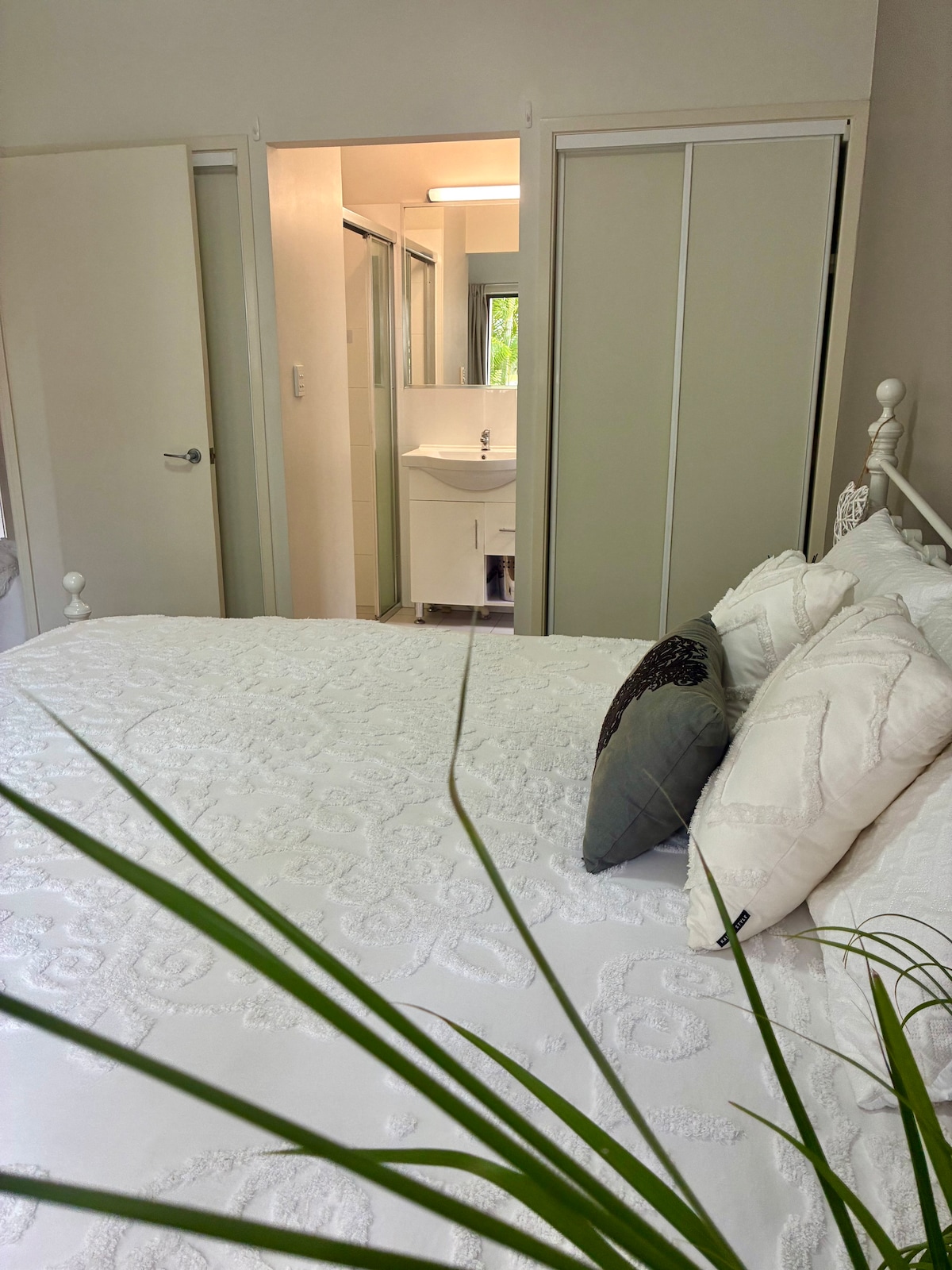 Large, light décor, main room with queen bed, kitchenette and dining, separate and very private bathroom, plus external deck. Nearby (walk 200 metres) shops and medical, restaurants, cafes, pizzas, liquor outlet, small supermarket, dentist; in the opposite direction it is 300 metres to Palm Grove NP. Note - this is a secluded, private place of comfort and not suited to children of any age. Nor is it a suitable place for wedding preparations, gatherings or any events.